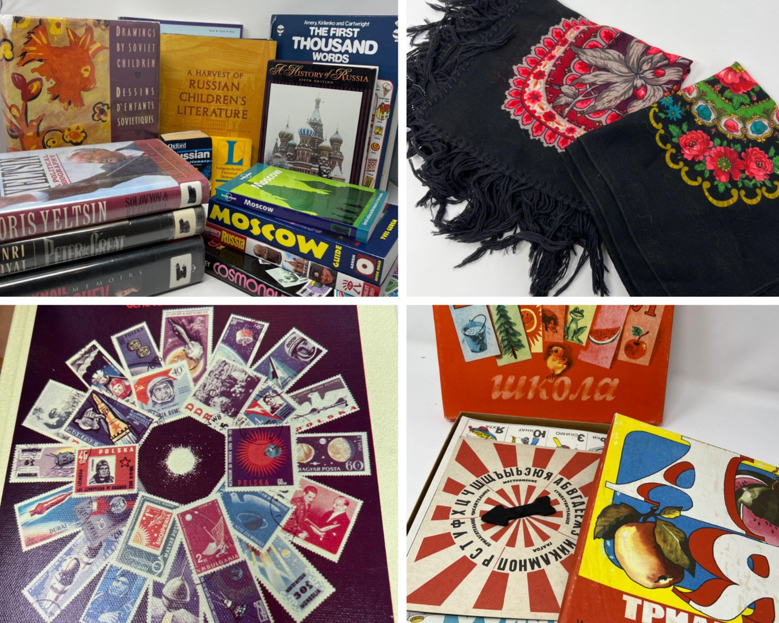 Books related to Russia, including a few vintage games and two fringed colorful shawls from Russia by Pavlovski Pasad. Shawls are 36” x 36”