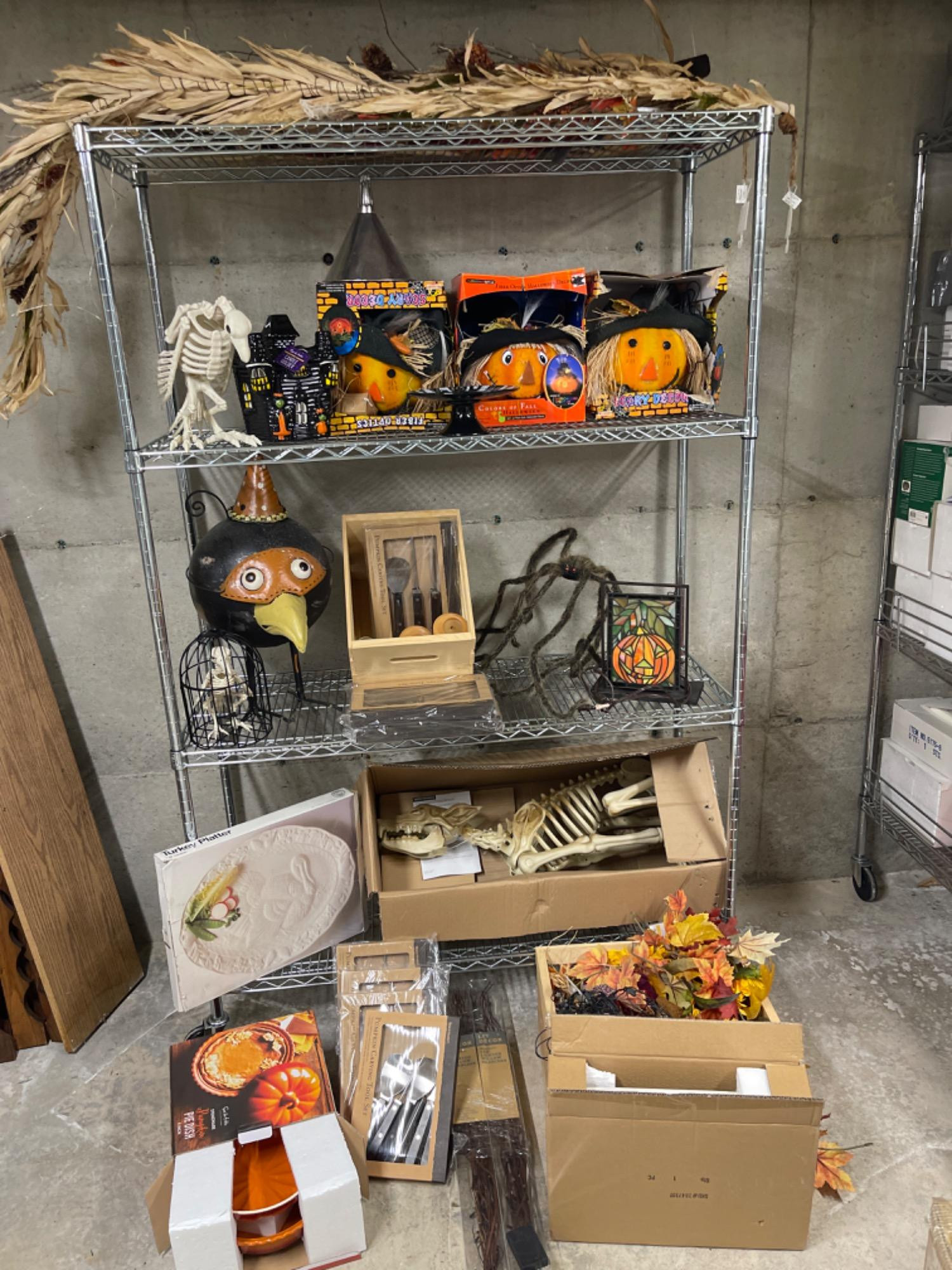 The shelf has a lot of new product, skeleton, ravens and animated dog skeleton, new kits of carving tools for pumpkins, lights, scary animated spider lighted, pumpkin, motif pie dish that is in the shaped of a pumpkin, turkey platter, scary decor that’s animated, fiber optics candle holder, serving dish, and lots of fall decor items Does not include the metal rack