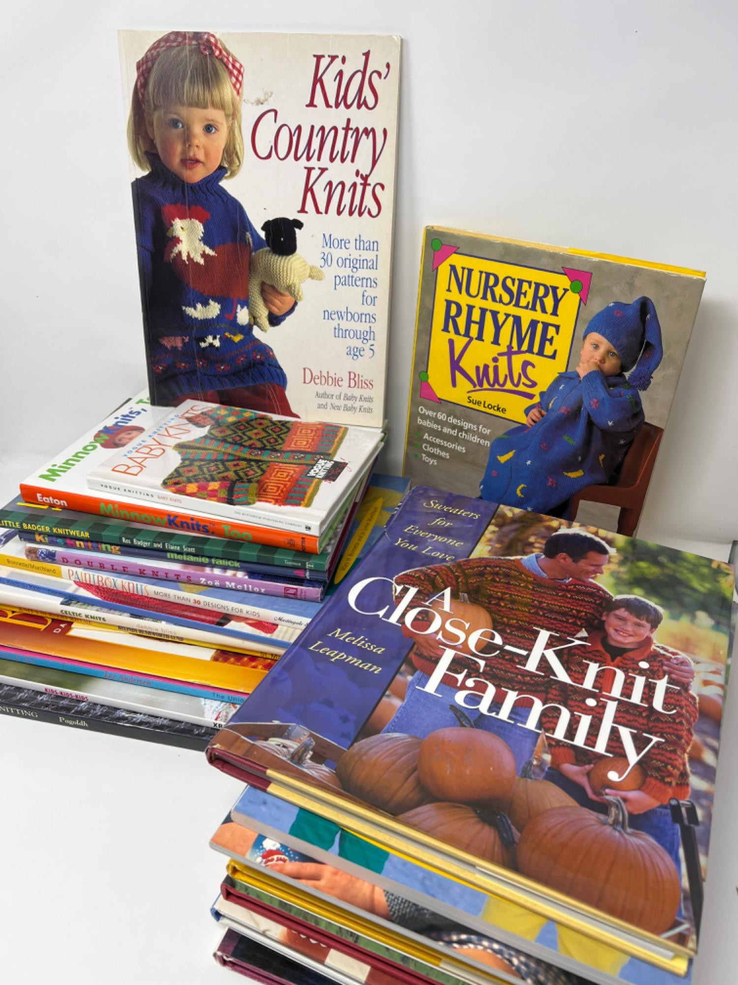 Several knitting pattern books by various authors including Debbie Bliss, Dale, Una Stubbs, Melissa Leapman, Belinda Rushworth-Lund, Zoe Meller, Paintbox Knits. Patterns for babies, toddlers, children and adults.