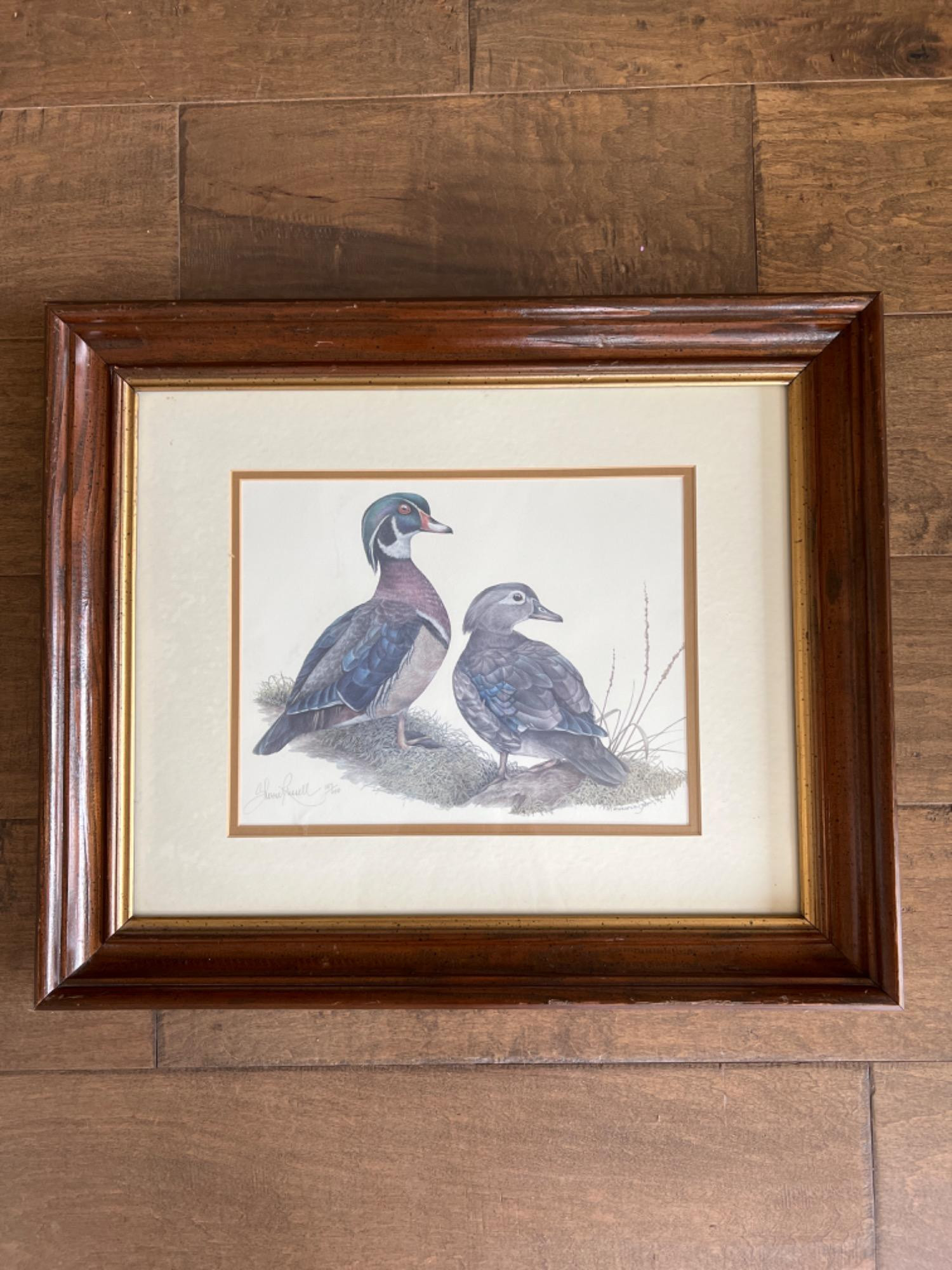 Pictured as found - Certificate of Authenticity, Sherrie Russell, artist, 157/400. Image size: 16 x 11.5”. Wood Ducks-Broken Silence signed and numbered 157 of 400. 25” wide x 20” tall.
