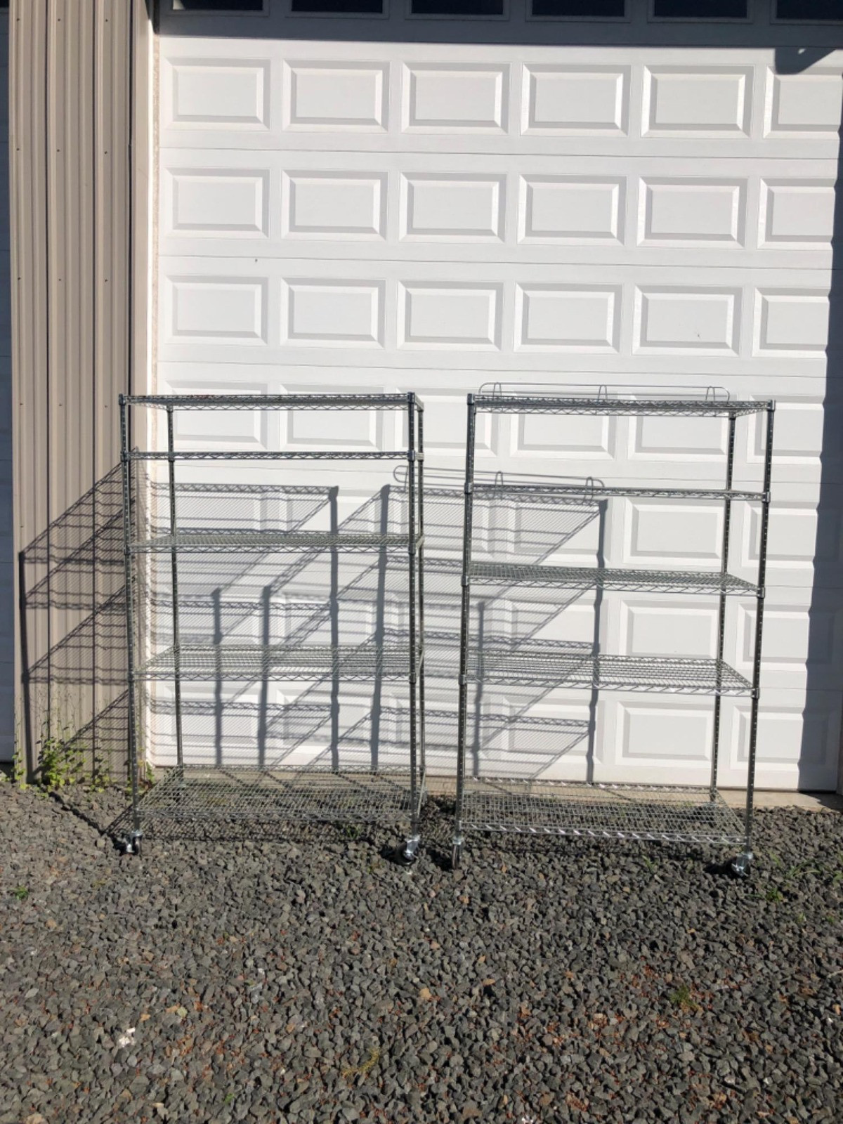2 Rolling Chrome Wire Shelving Units Approximate Dimensions: 77 inches high x 23.5 inches deep x 47 inches wide Bidding on this lot is an agreement that: (1.) If you intend to disassemble this item for transport, that you will bring the necessary tools to do so and you have the manpower to disassemble and lift and place in your vehicle. If these