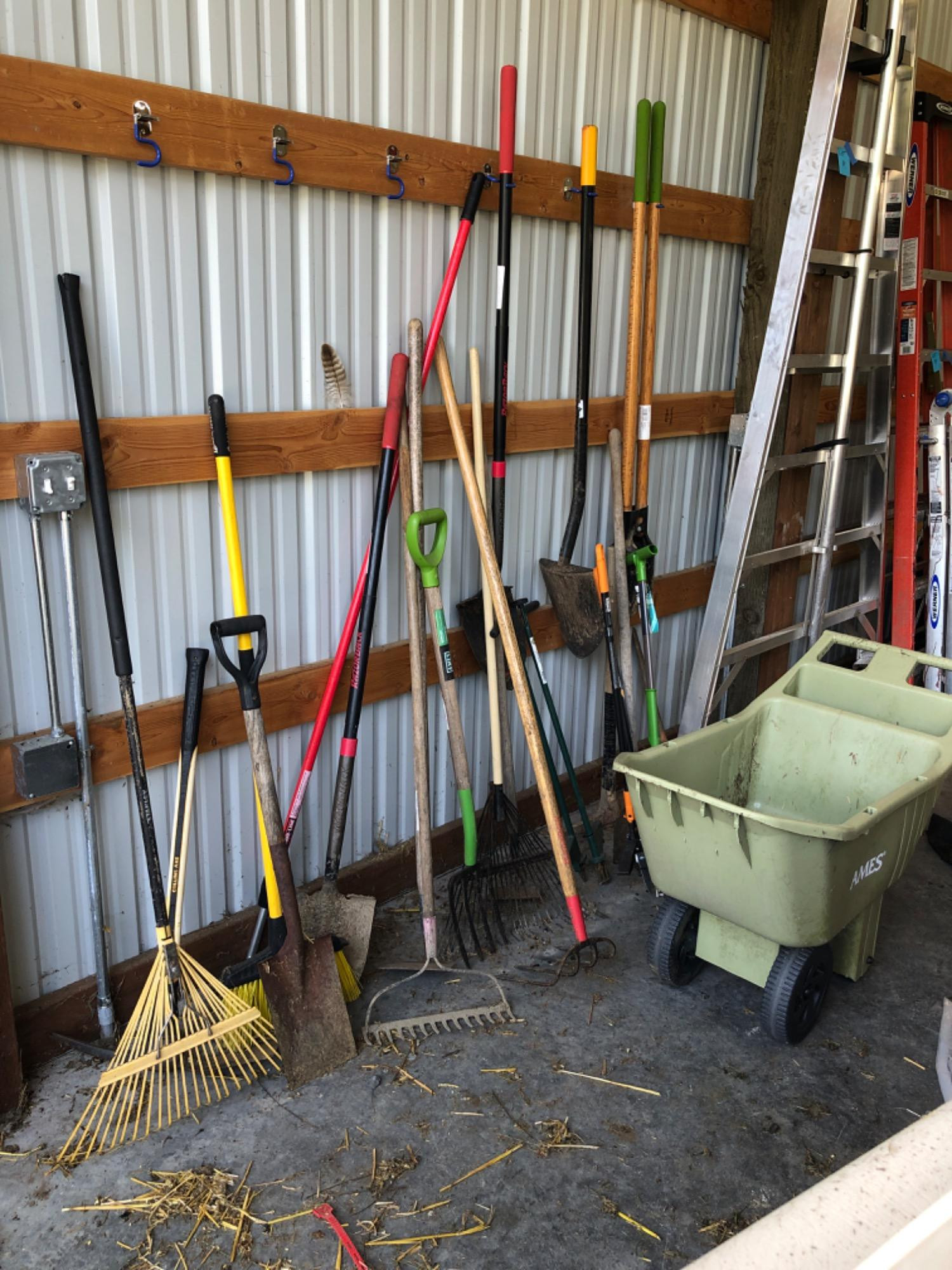 Lot Includes: Rakes, shovels, multiple weeding tools, garden cart/wheelbarrow, hoes, post hole digger, pitch forks & more