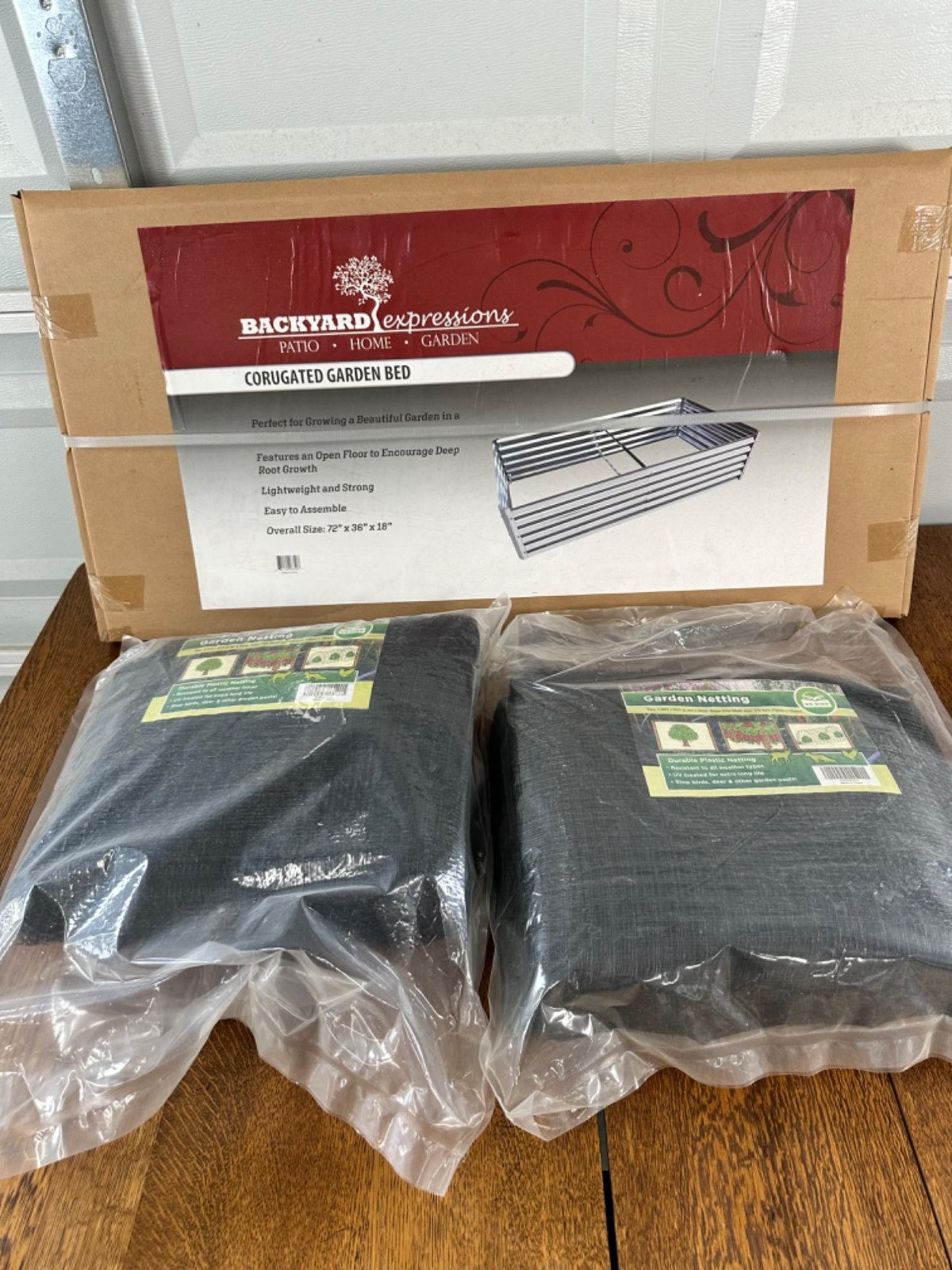 Corrugate raised garden bed New in box Includes new netting to cover the beds Dimensions: 72 x 36 x 18