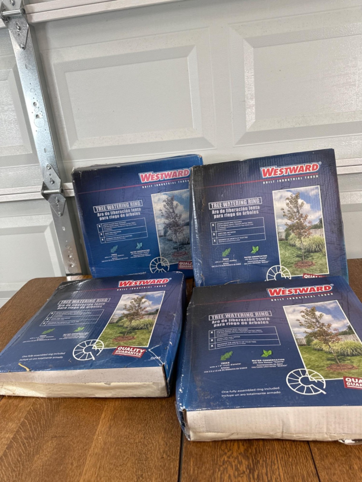 Four Westward Tree Watering Ring Unopened in box Specifications: Tree-Watering Ring, Hose Color Black, Temp. Range 100 Degrees F, Hose Configuration Coupled Assembly, Features 3/4 in GHT, For 1 in to 3 in Diameter Trees, Fully Assembled, Kink Resistant No, Garden Hose Type Soaker Hose