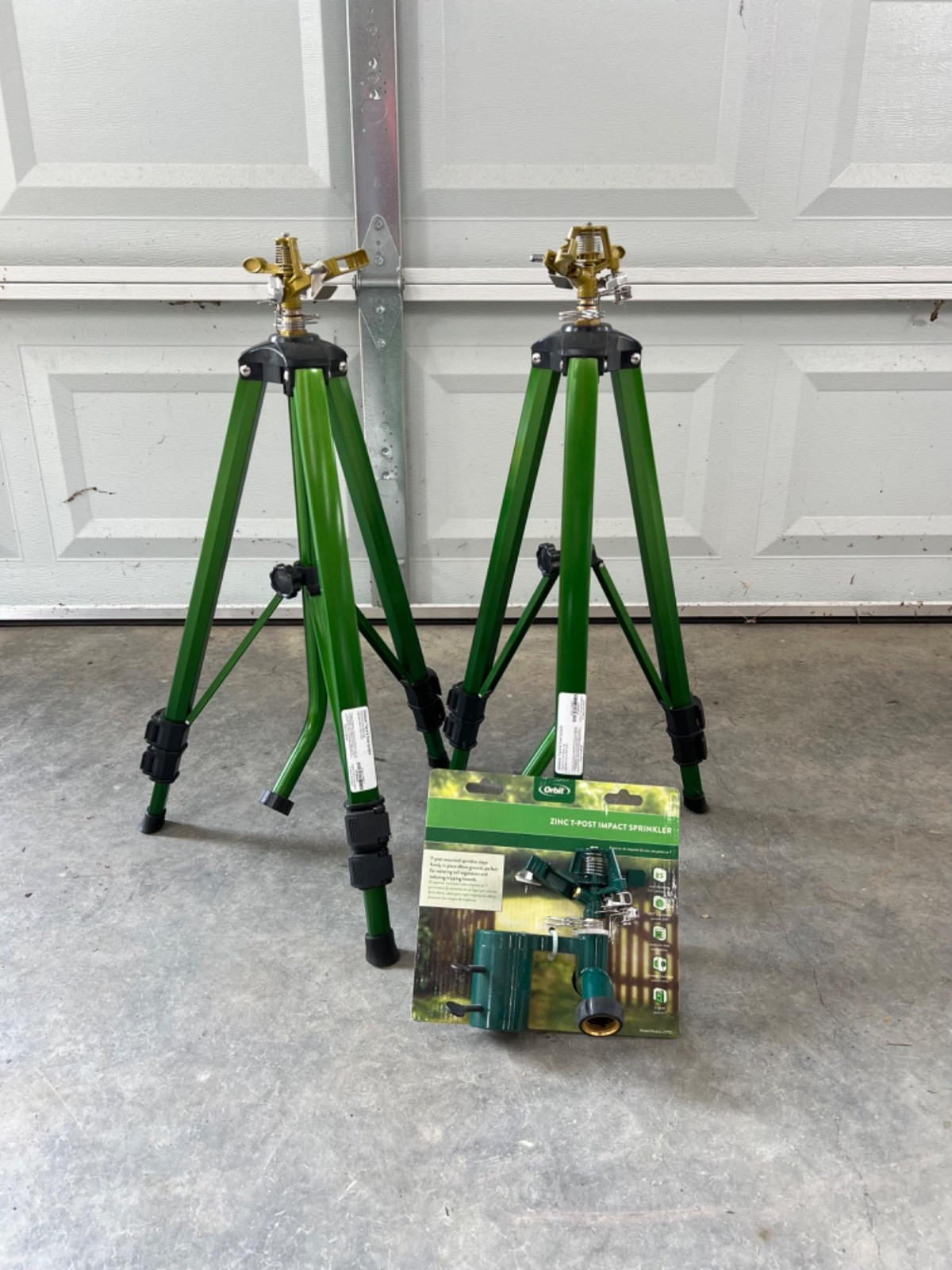 Pair of Orbit Tripod Sprinklers with Telescoping Legs Brand New and Never Used Adjustable legs allow for greater water coverage Lot also includes Zinc T-Post Impact Sprinkler