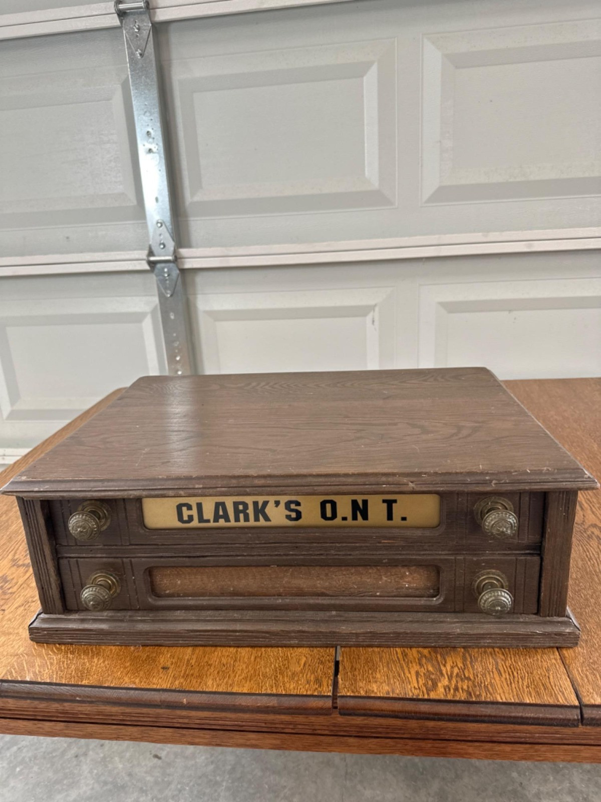 Antique Clark's O.N.T Sewing Spool Cabinet Dimensions: 22 inches wide by 15 inches deep by 7 1/2 inches tall