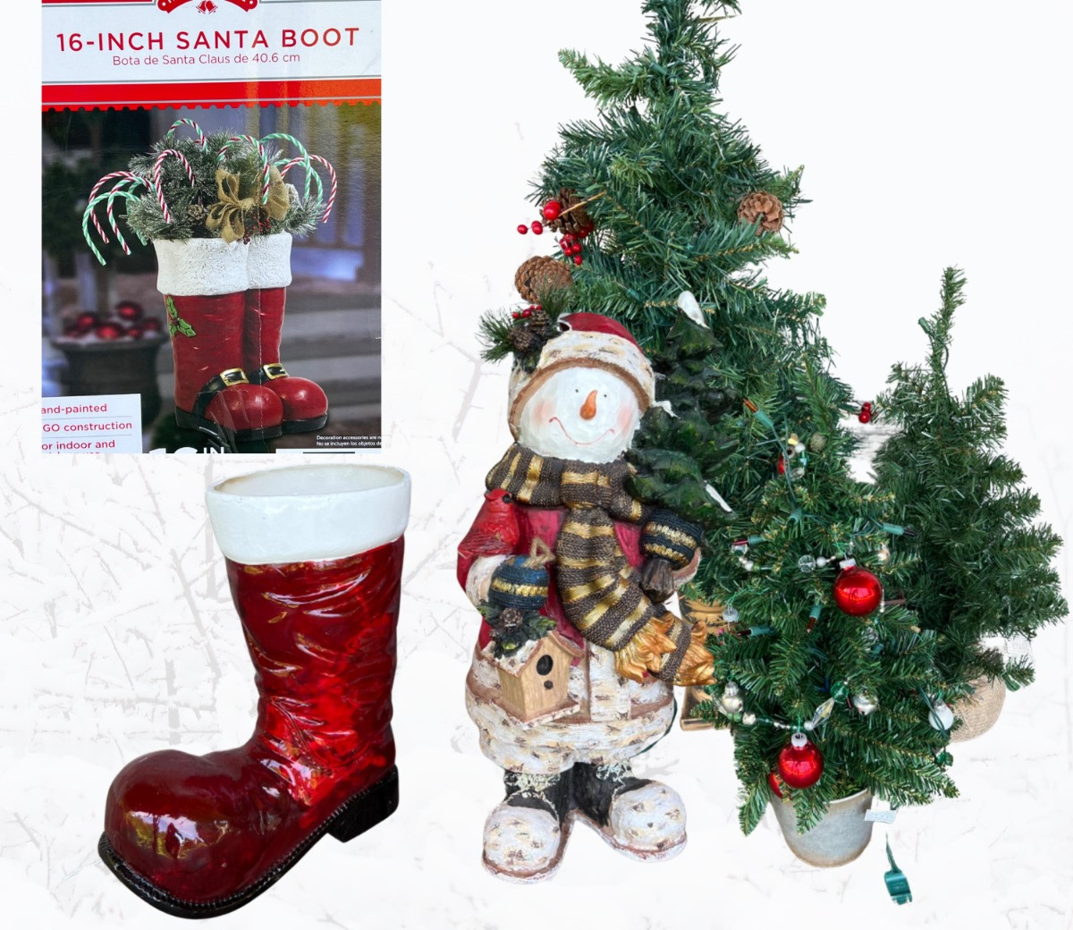 Snowman - 18" tall Boot - 14” tall Boxed Double Boots - 16” tall Smaller Trees - 14” tall Taller Tree 23” tall