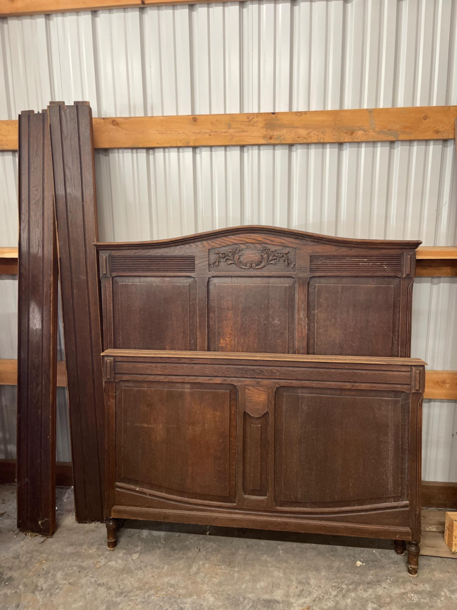 Antique wood queen size bed with headboard, footboard and runners Headboard- 57” w x 58” T Foot- 37” length-84” Bidding on this lot is an agreement that: (1.) You