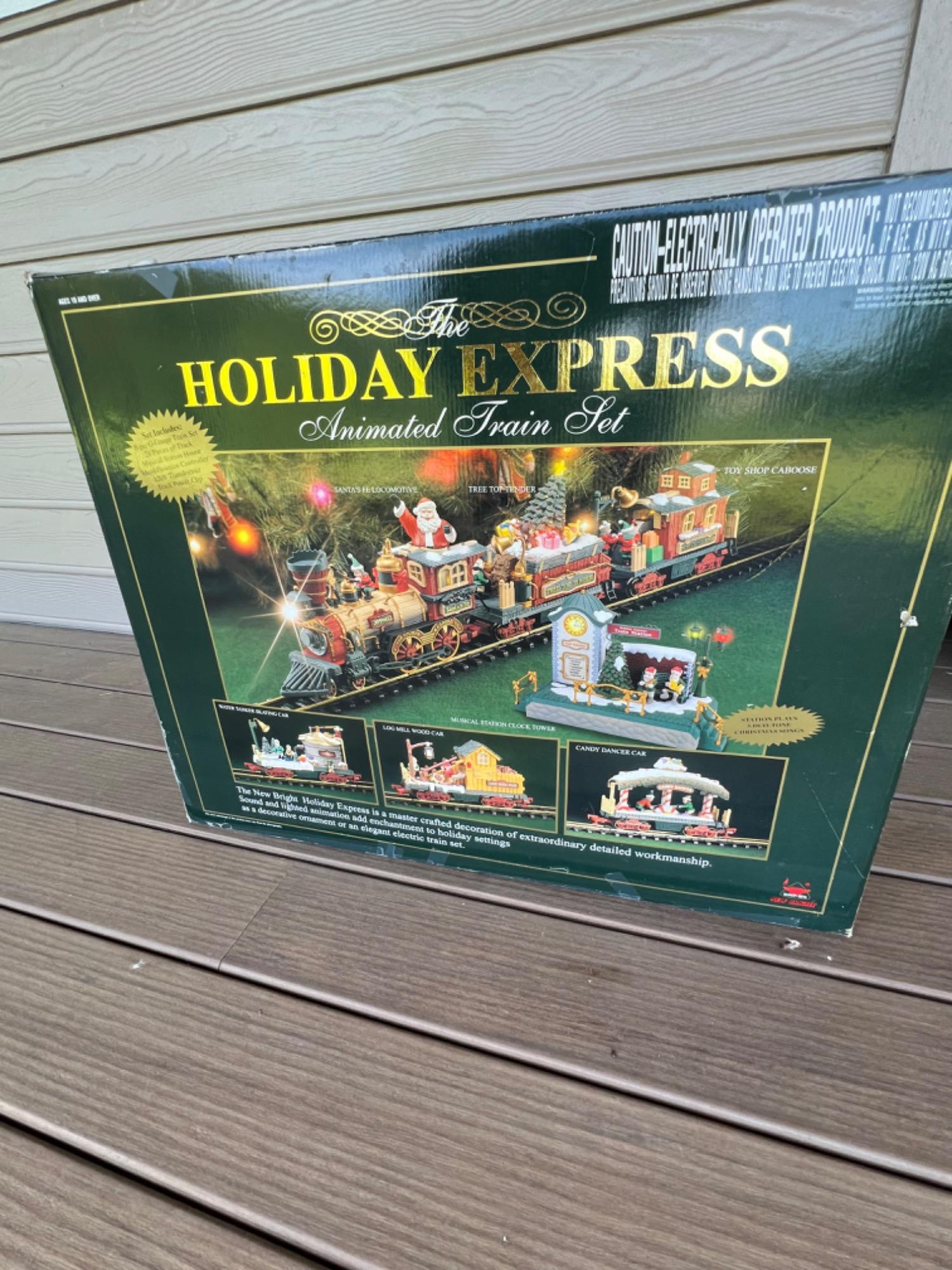 Holiday Express Christmas Train. Engine, caboose, and 6 cars. Track, remote and transformer. In working condition. Has original box.