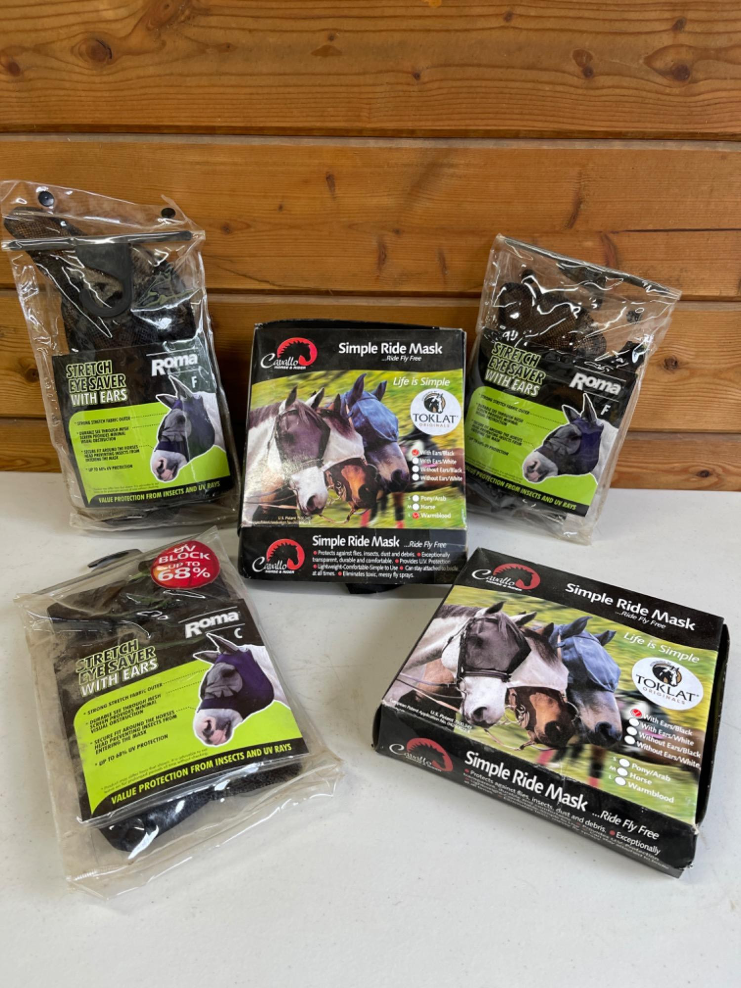 Five what appeared to be new packaged ride masks for Horses three packages of Roma brand 2F and one C package and then Cabo brand two boxes and both for warm blood with ears and black.