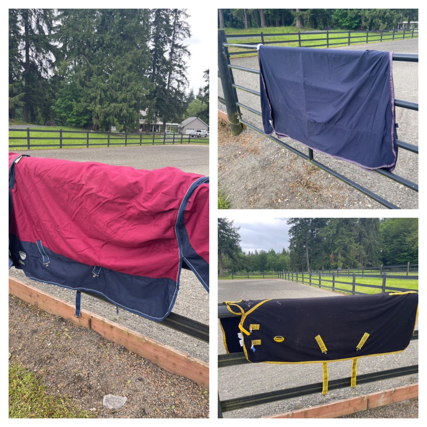 Weatherbeeta Horse Blankets 75” Tunaka with hood (zipper needs repair) Includes Weatherbeeta cooling blanket and a fleece and one more.