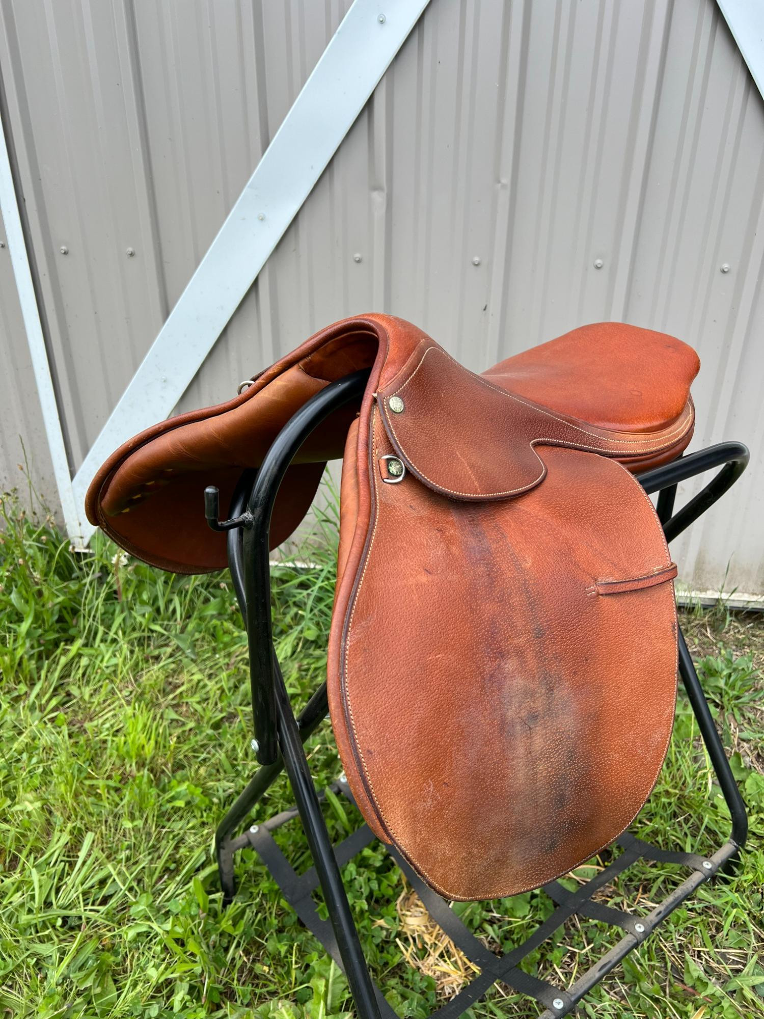 Vintage Blue Ribbon Leather Co. tan leather English riding saddle. Made in England. Size: 20" wide, 3.75" neck