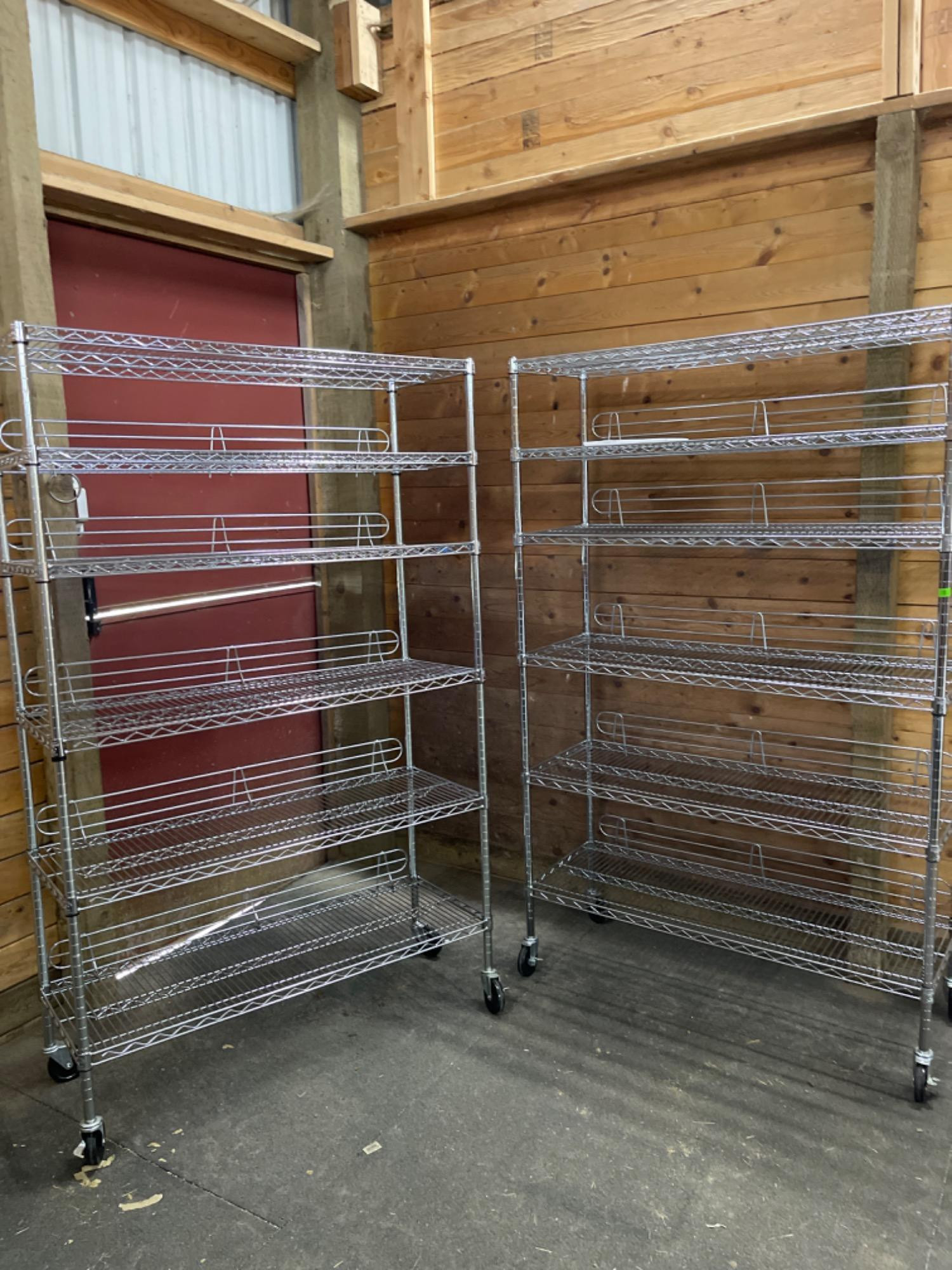 Two Chrome Wire Rolling Storage Racks Dimensions: Height - 77 Inches Width - 47.5 Inches Depth - 18 Inches Bidding on this lot is an agreement that: (1.) If you intend to disassemble this item for transport, that you will bring the necessary tools to do so and you have the manpower to disassemble and lift and place in your vehicle. If these