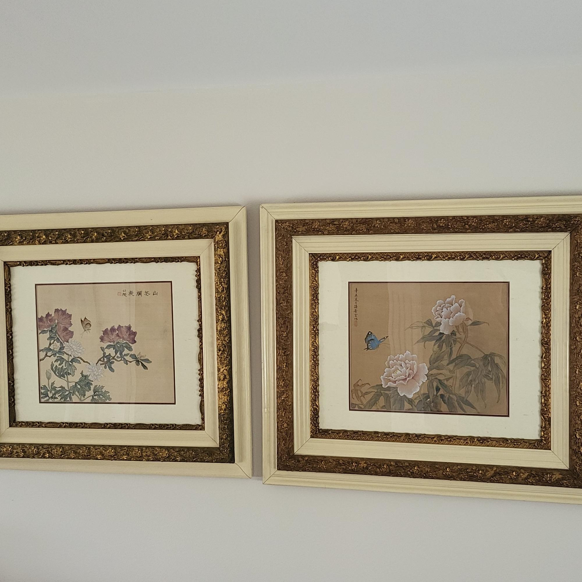 Pair of Chinese hand painted flower and butterfly paintings on silk. 1970's highly detailed gold gilt and ivory colored painted wood frames from Upper Peninsula Michigan. Frames are 39" wide x 26" tall x 1.5" deep.