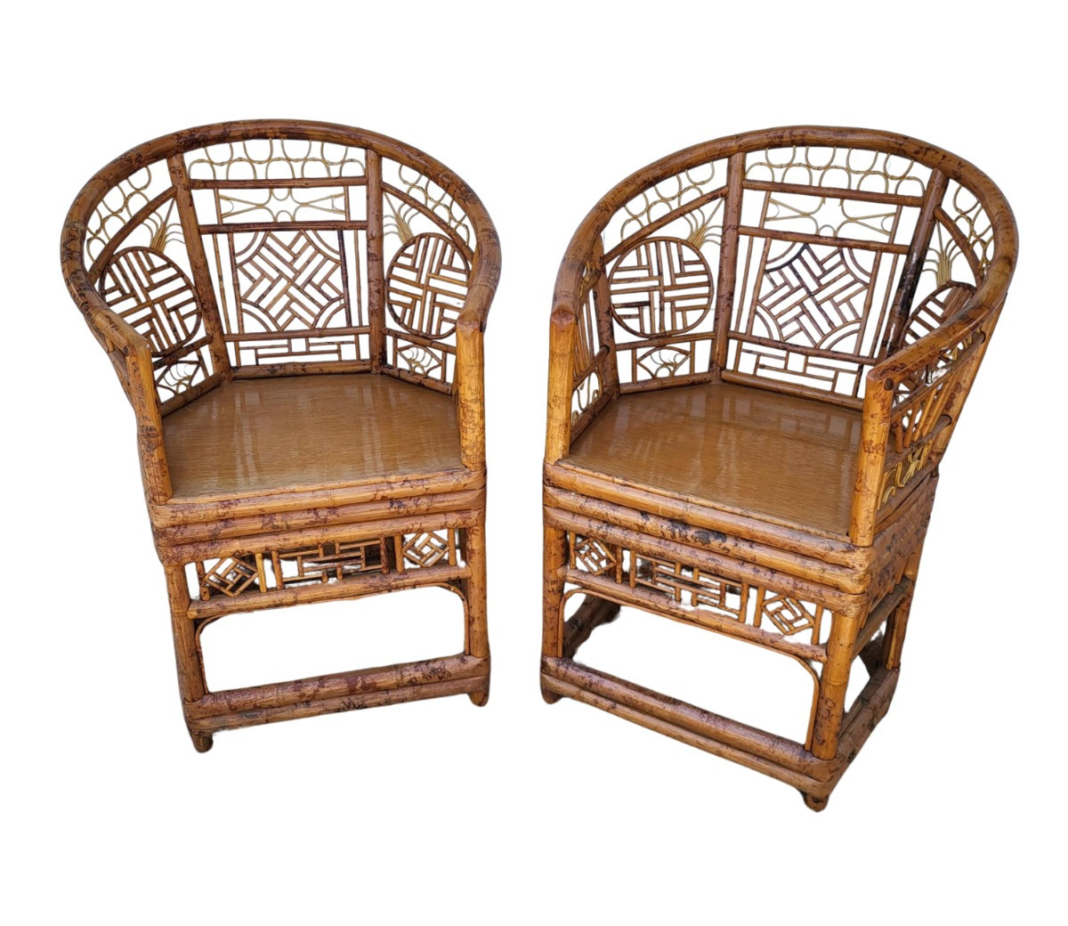 Mid-70's Korean bamboo Pavillion/Club chairs. Quality, beautifully constructed, detailed barell backs. They measure 26" wide x 37" tall x 18" deep.