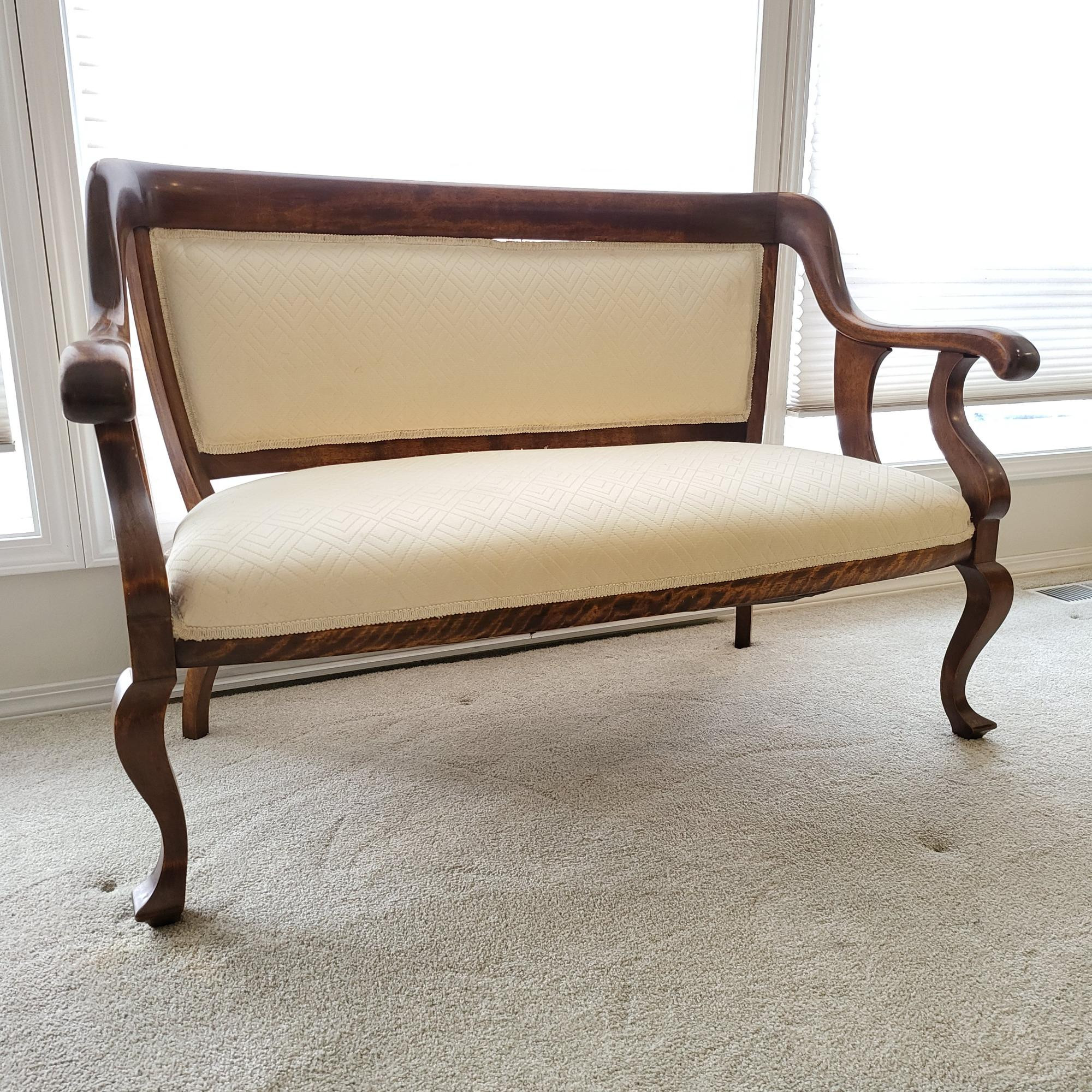 Soft ivory colored fabric/upholstery with subtle chevron pattern. Measures 50" long x 33" tall from back of seat x 23" deep. Seat cushion is 20" deep. Curved armrests and legs.