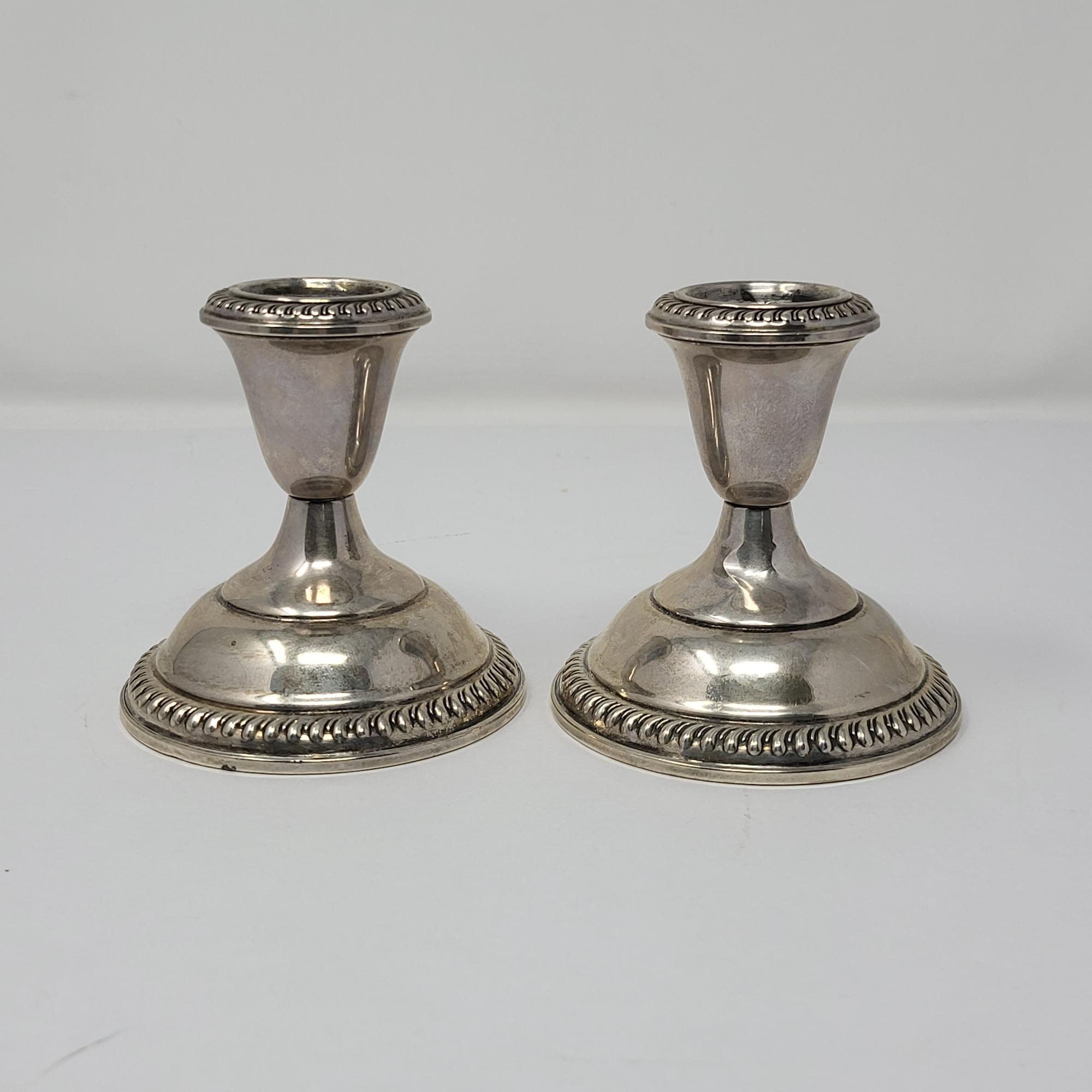Pair of Empire 46, weighted Sterling Silver candlestick holders 3.5" tall. Included is a small sterling cup stamped #196. Measures 2.75" tall x 2.75" wide at top.