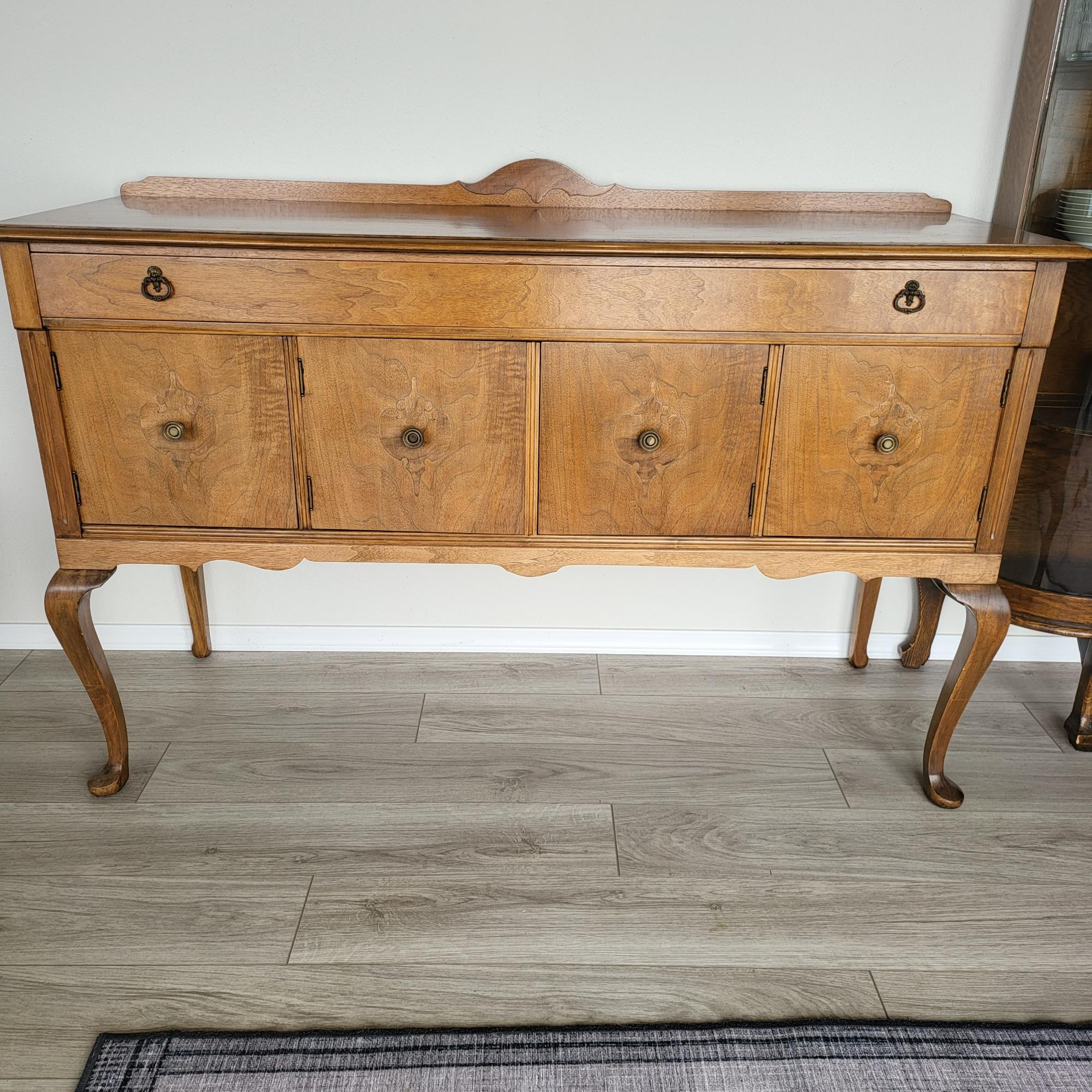 Beautiful antique solid walnut(?) Sideboard buffet. Top drawer is full length of buffet and is 3.25" deep. Bottom has four doors with a compartment on either side and center compartment. Measures 60.5" long x 38" tall x 21" deep. Dovetailed drawers, Queen Anne style legs, bronzed drawer pulls. Bidding on this lot is an agreement that: (1.) You will have 2 capable, able bodied persons to lift and load at a minimum. (2.) You will bring a hand truck and/or any other tools needed to remove this item. If these steps are not followed your item will be forfeit and no refund given. Note* Item is located on main floor with two stairs to get to the door and few outside stairs leading to a 20 degree steep driveway. Parking at the top of the driveway where it is flatter will make it easier for you to load.
