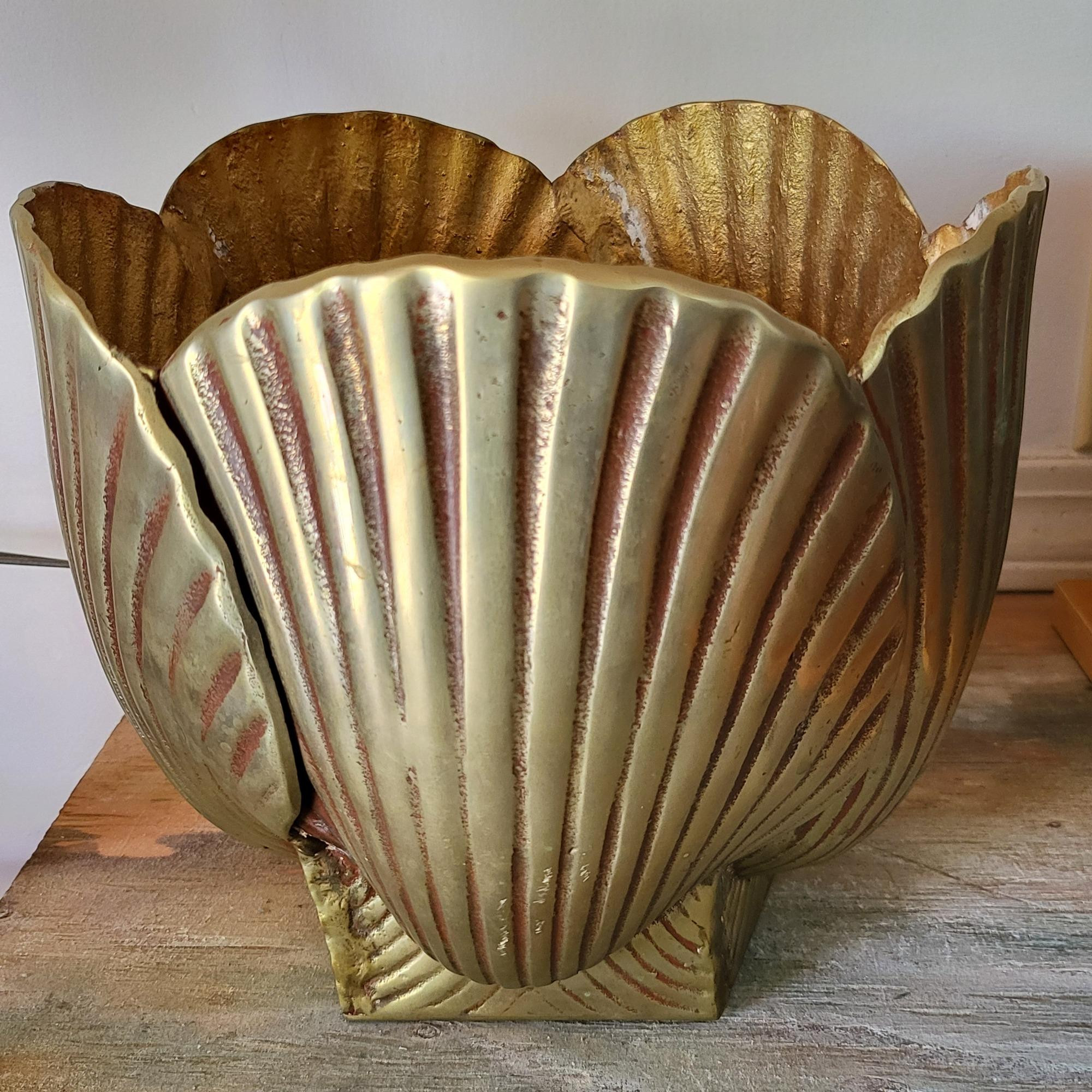 Heavy, solid brass with nice patina, clamshell planter. Measures 9" x 8.5"