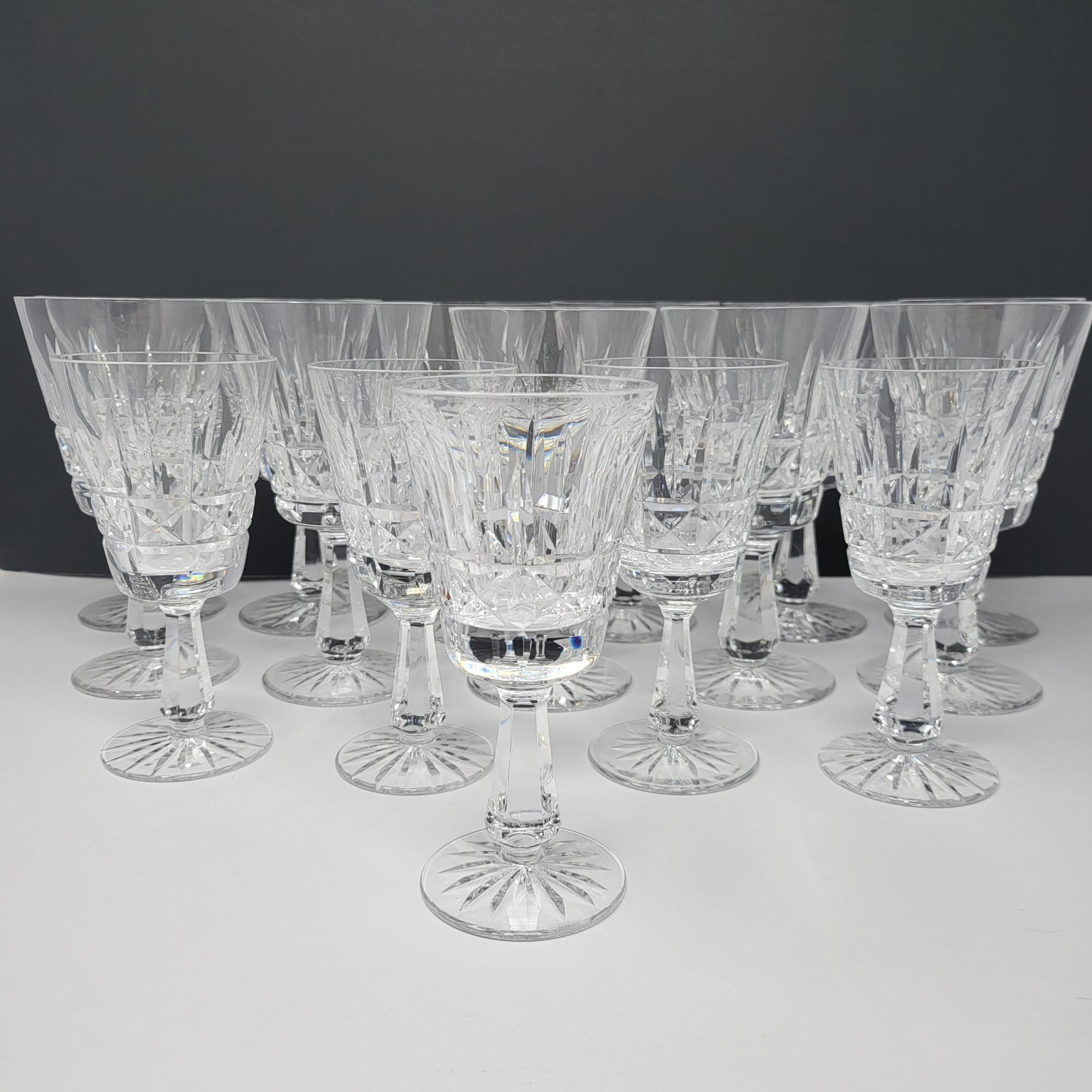 Fine, Waterford Kylemore crystal stemmed glassware. Five 6" tall x 3" wide flared stemmed glasses. Eleven 7" tall x 3.5" wide wine glasses. All stamped Waterford. *Please bring your own packing material & supplies to transport this item, as there will not be any available on site.