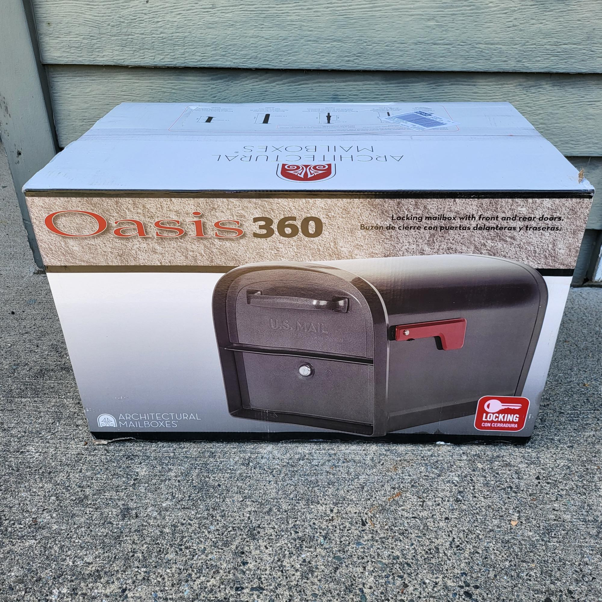 New in Box. Oasis 360 black galvanized steel, locking mailbox, 11.5" x 20".