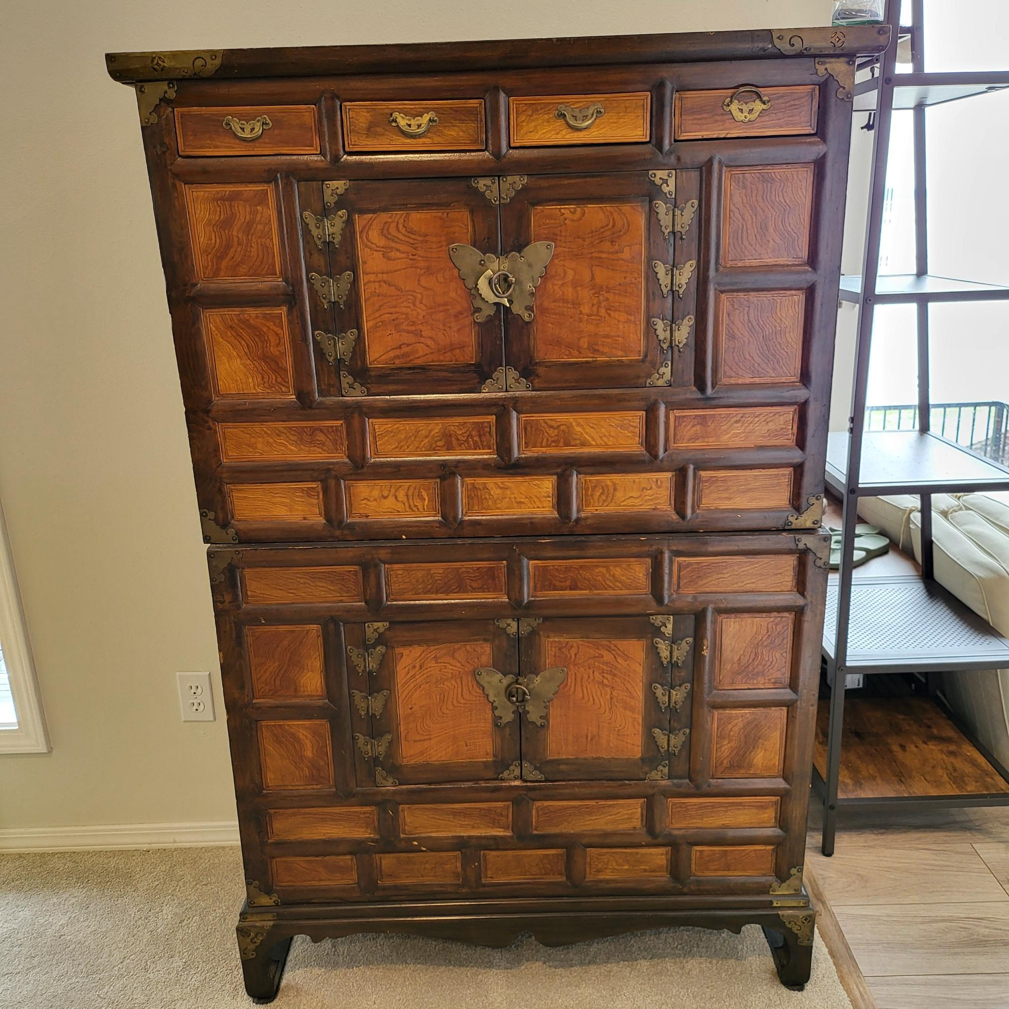 Stunning, antique Asian two piece blanket cabinet - top is 26.5" tall, bottom piece is 33" tall. Overall measurements 39" long x 59.5" tall x 18" deep. Top piece has four small drawers with brass pulls and main opening for storage. Bottom piece has one main opening for storage. Decorative brass butterfly hardware. Uniquely constructed with no nails but rather with bamboo pegs. This two piece design makes it easier o move. Bidding on this lot is an agreement that: (1.) You will have 2 capable, able bodied persons to lift and load at a minimum. (2.) You will bring a hand truck and/or any other tools needed to remove this item. If these steps are not followed your item will be forfeit and no refund given. *Note* Item is located on main floor with two stairs to get to the door and few outside stairs leading to a 20 degree steep driveway. Parking at the top of the driveway where it is flatter will make it easier for you to load.
