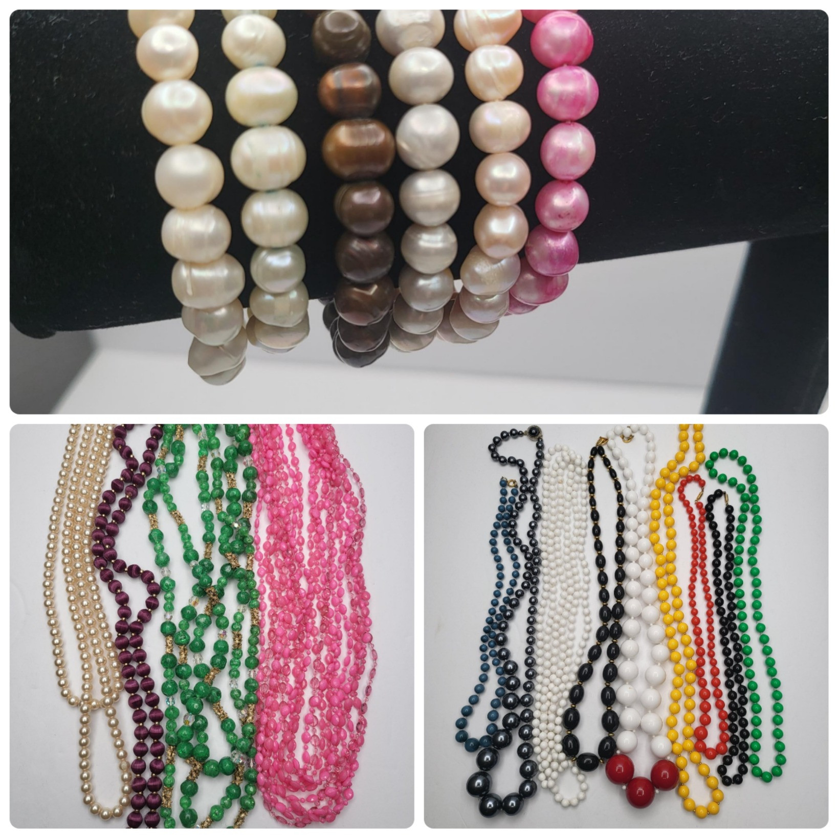 Variety of fabulous, colorful vintage single strand and multi strand plastic beaded necklaces. Shortest is 23" to longest being 88". Includes Monet and Napier and unsigned. There is also six pearl stretch bracelets.