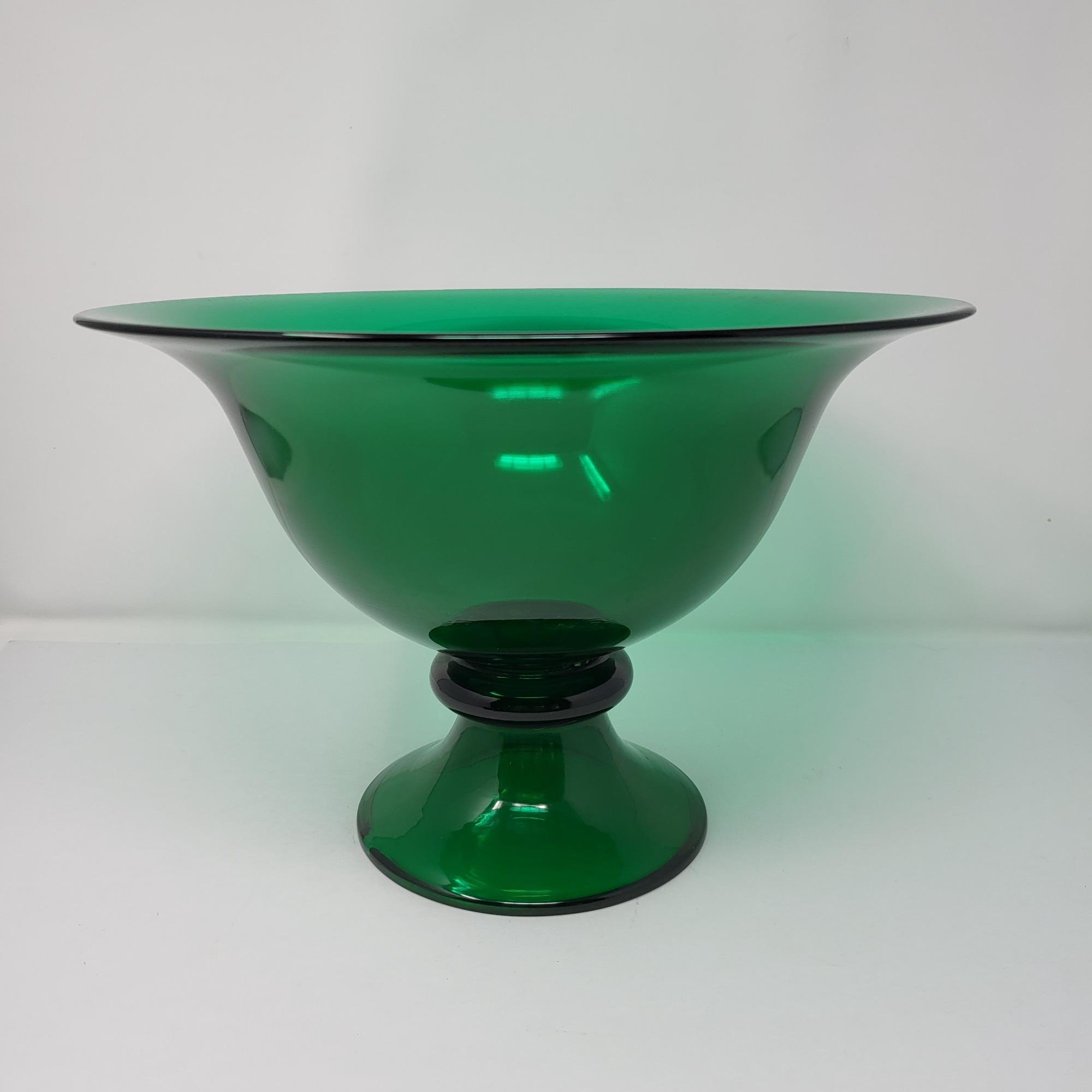Large Kelly green glass pedastal fruit/decor bowl centerpiece, measures 13.5" wide x 9.25" tall. Small flaw on underside.