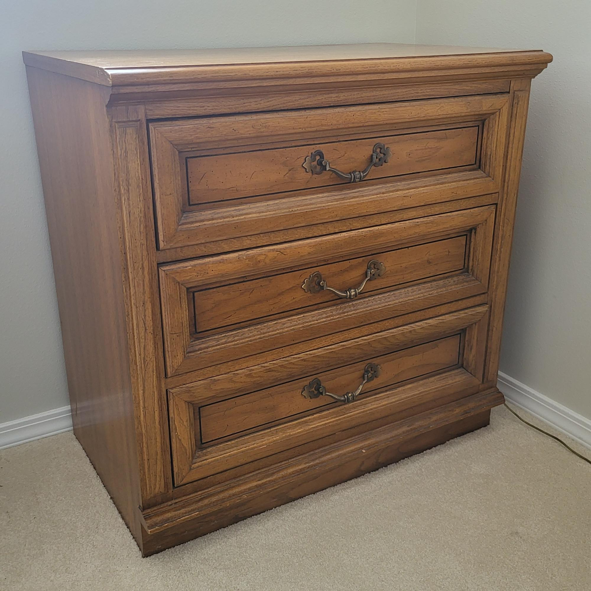 Dixie Furniture Company. Dresser measures 30" wide x 30" tall x 19" deep. Pair of matching side tables are 24" wide x 23" tall x 17" deep. Bidding on this lot is an agreement that: (1.) You will have 2 capable, able bodied persons to lift and load at a minimum. (2.) You will bring a hand truck and/or any other tools needed to remove this item. If these steps are not followed your item will be forfeit and no refund given. Note* Item is located on second floor with a flight of stairs to get to the front door and few outside stairs leading to a 20 degree steep driveway. Parking at the top of the driveway where it is flatter will make it easier for you to load.