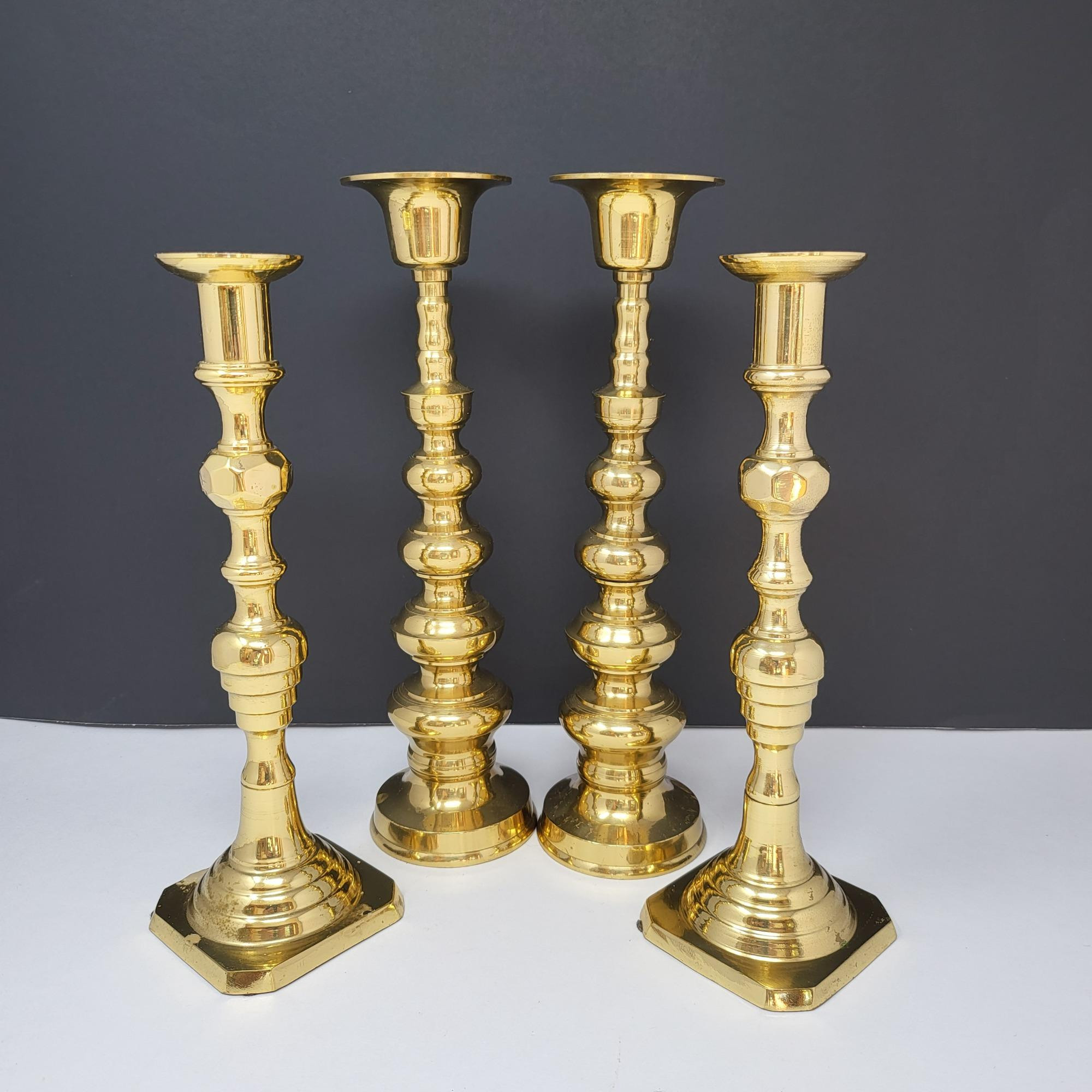Two pair pillar style brass candle stickholders, Japan. 10.5" and 13" tall.