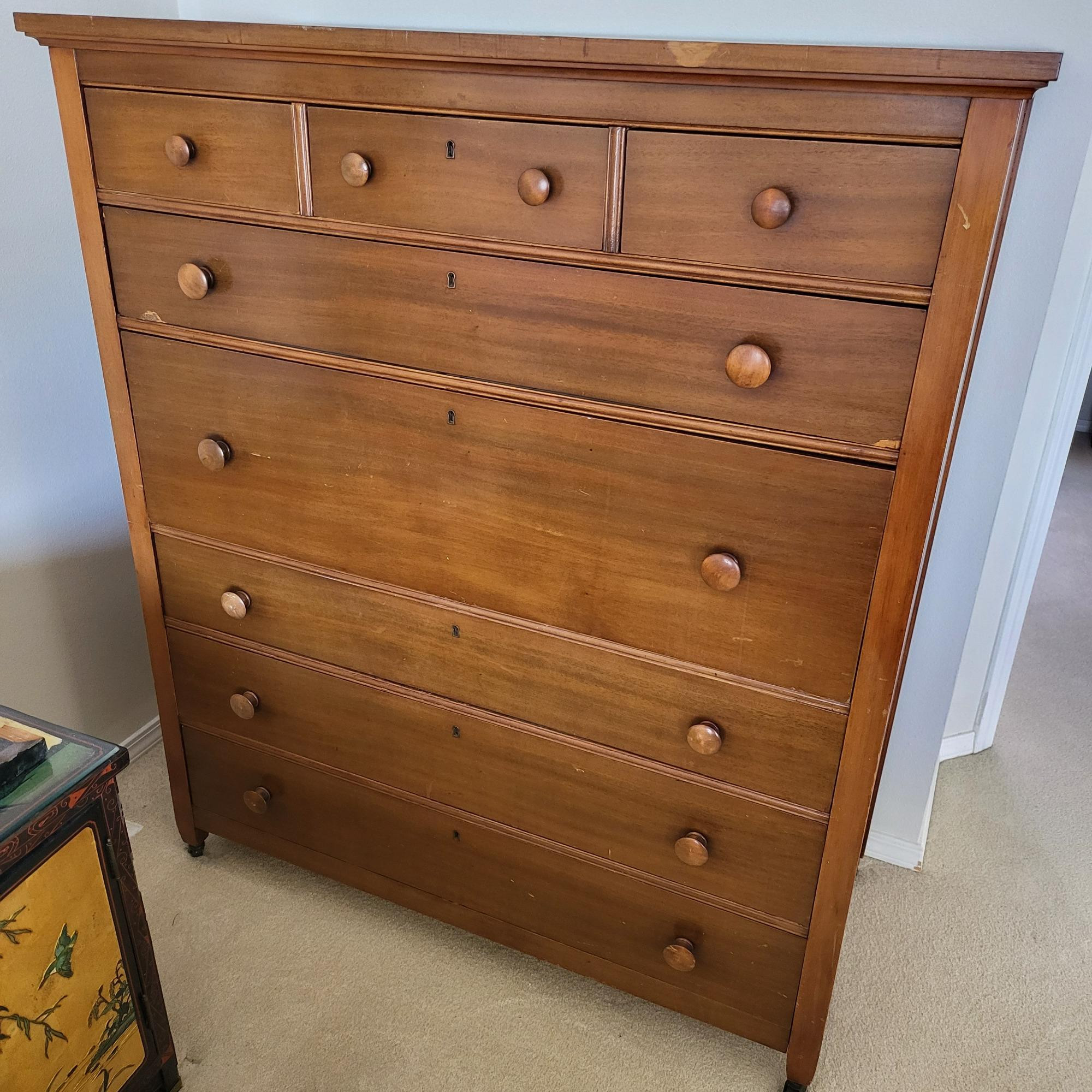 Antique, solid wood dresser on wheels. Dovetailed drawers and round pulls. Top row has three smaller drawers, next is a full length drawer, then a extra deep drawer with 3 compartments, and three full length bottom drawers. Measures 47" long x 56" tall x 23" wide. Bidding on this lot is an agreement that: (1.) You will have 2 capable, able bodied persons to lift and load at a minimum. (2.) You will bring a hand truck and/or any other tools needed to remove this item. If these steps are not followed your item will be forfeit and no refund given. Note* Item is located on second floor with a flight of stairs to get to the front door and few outside stairs leading to a 20 degree steep driveway. Parking at the top of the driveway where it is flatter will make it easier for you to load.