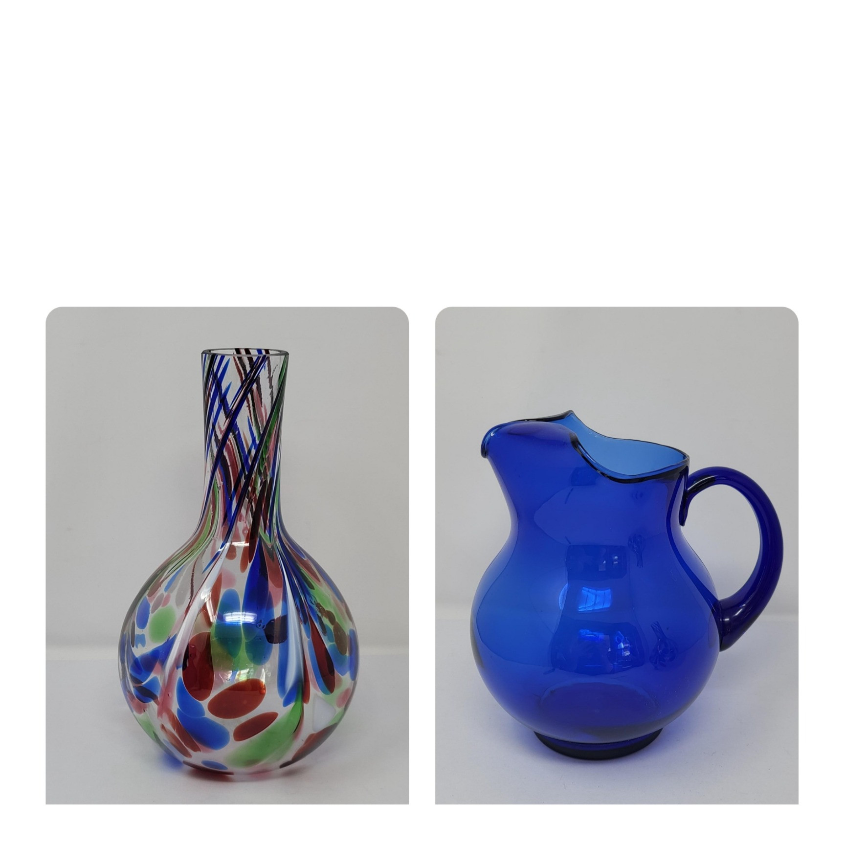Lot # 117 - Cobalt Water Pitcher & Multi-Colored Stretch Spots Art Glass Vase