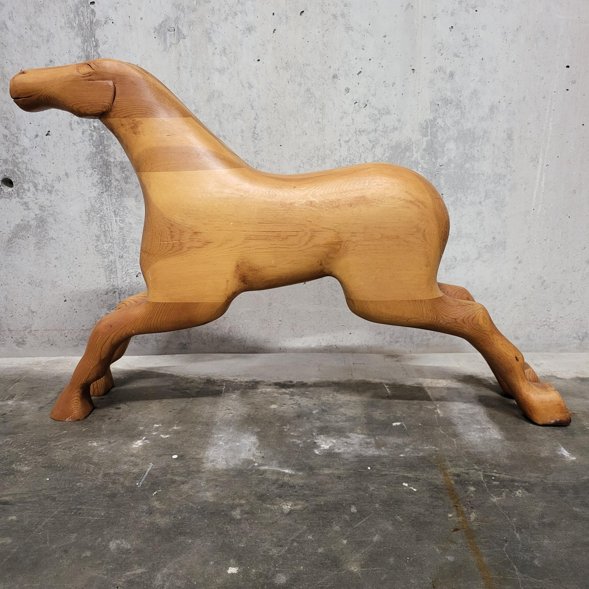 Unique, mid-century hand carved wood horse is 32" long x 21.5" tall x 6" deep. Wooden nails. Hand crafted, unsigned. Looks like it's is possibly unfinished since there is no mane or tail.