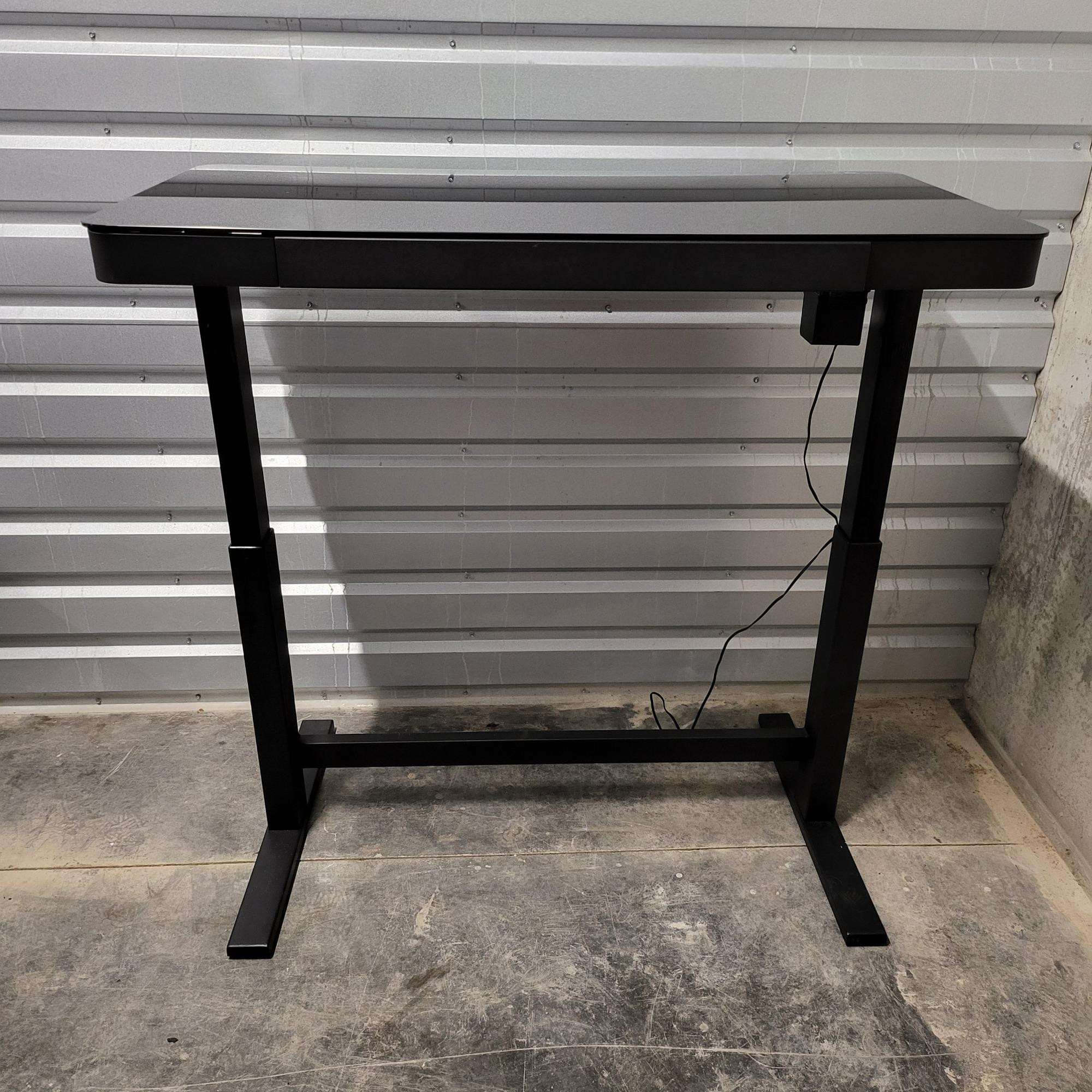 Manufactured by TSI, ergonomic electric adjustable sit/stand tempered glass top desk in black. Tallest 47" high (29.5" at it's shortest height) x 47" wide x 23.5" deep (legs 25.5" deep)x 2.75" desk top thickness. Several USB ports on the side. Digital display on top. Quiet lift. Bidding on this lot is an agreement that: (1.) You will have 2 capable, able-bodied persons to lift and load at a minimum. (2.) You will bring a hand truck and/or any other tools needed to remove this item. You will bring your own moving blankets, or wrap to protect against damage. If these steps are not followed your item will be forfeited and no refund given.