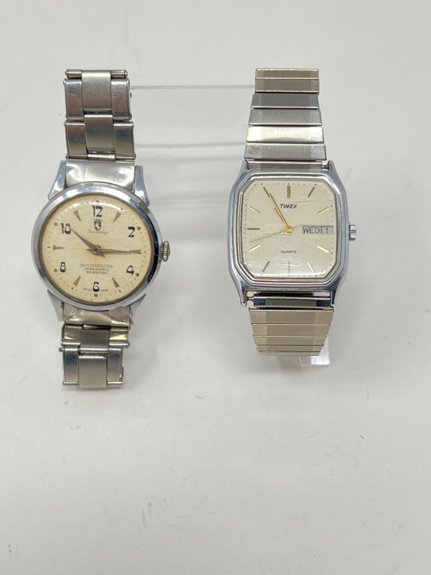 Rare vintage Swiss made Sovereign watch with partial stretch band. 1960’s Vintage Timex - T56 with date. Watches need Batteries. May have some scratches on crystal.