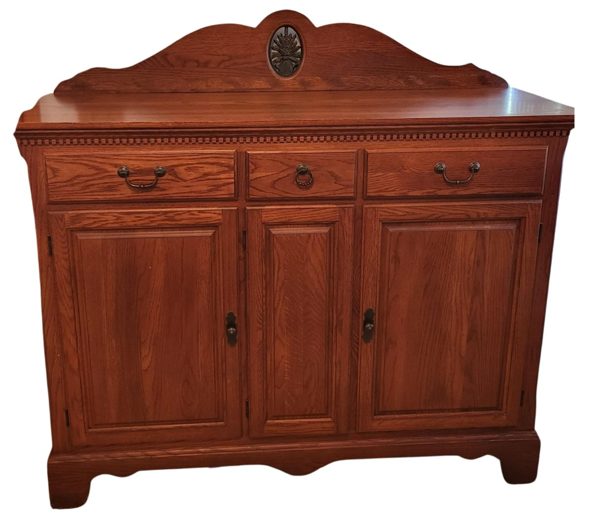 Hekman wood sideboard cabinet is 55" long x 19" deep x 51" tall. Three top drawers, bottom has three doors that open to two shelves for storage. Bidding on this lot is an agreement that: (1.) You