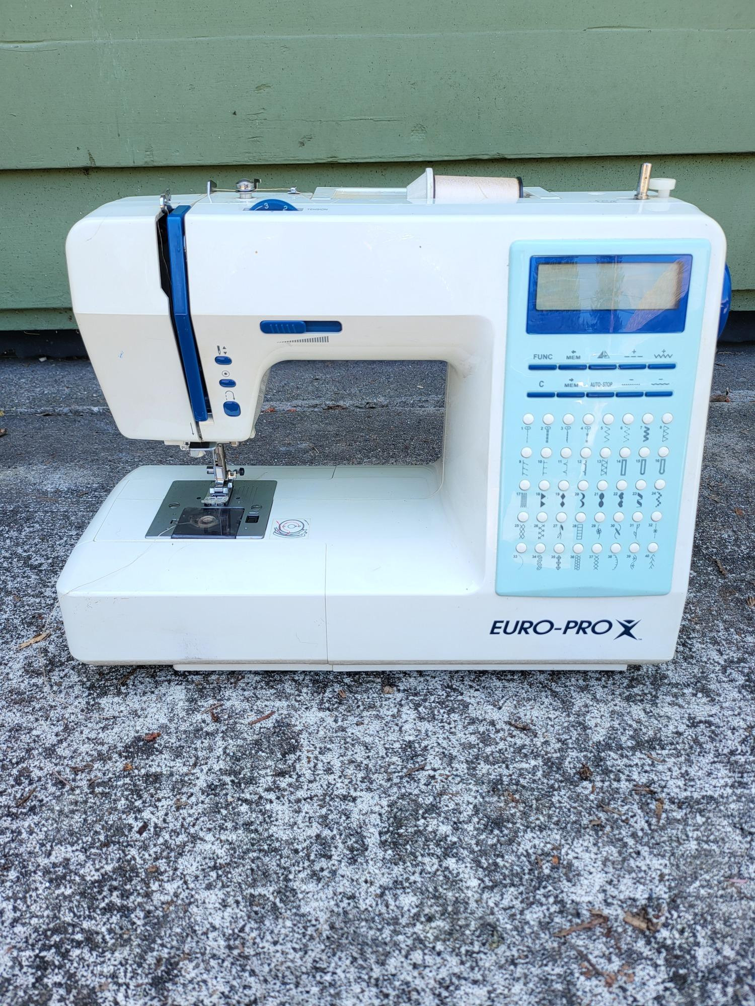 Euro Pro Deluxe Denim & Silk sewing machine with carry case and foot pedal, model 9106. Untested.