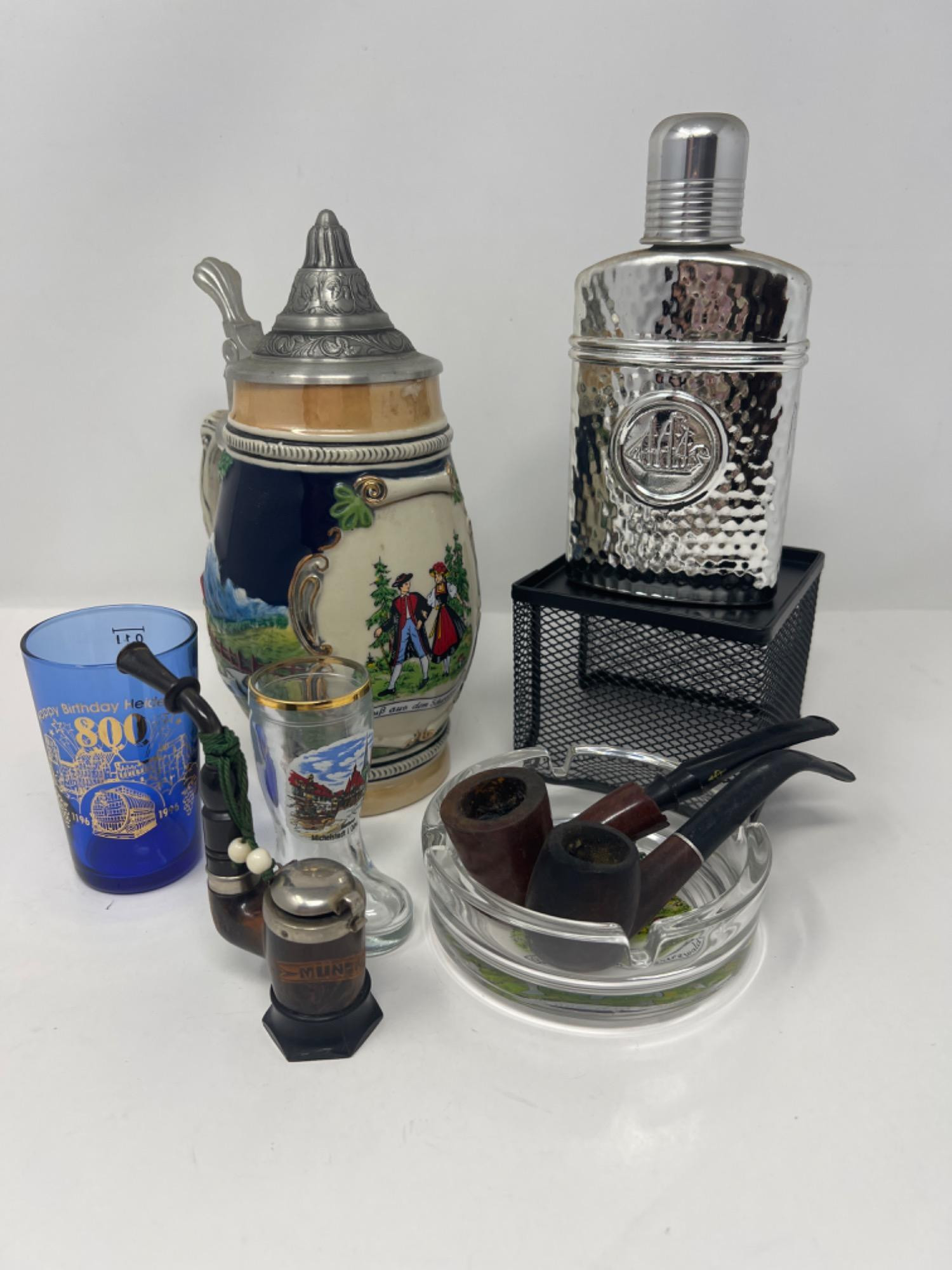 Variety of men's items from cabinet - vintage pipes, ashtray, silver toned flask, souvenir shot glasses, and 8-9" tall Stein with pewter lid.