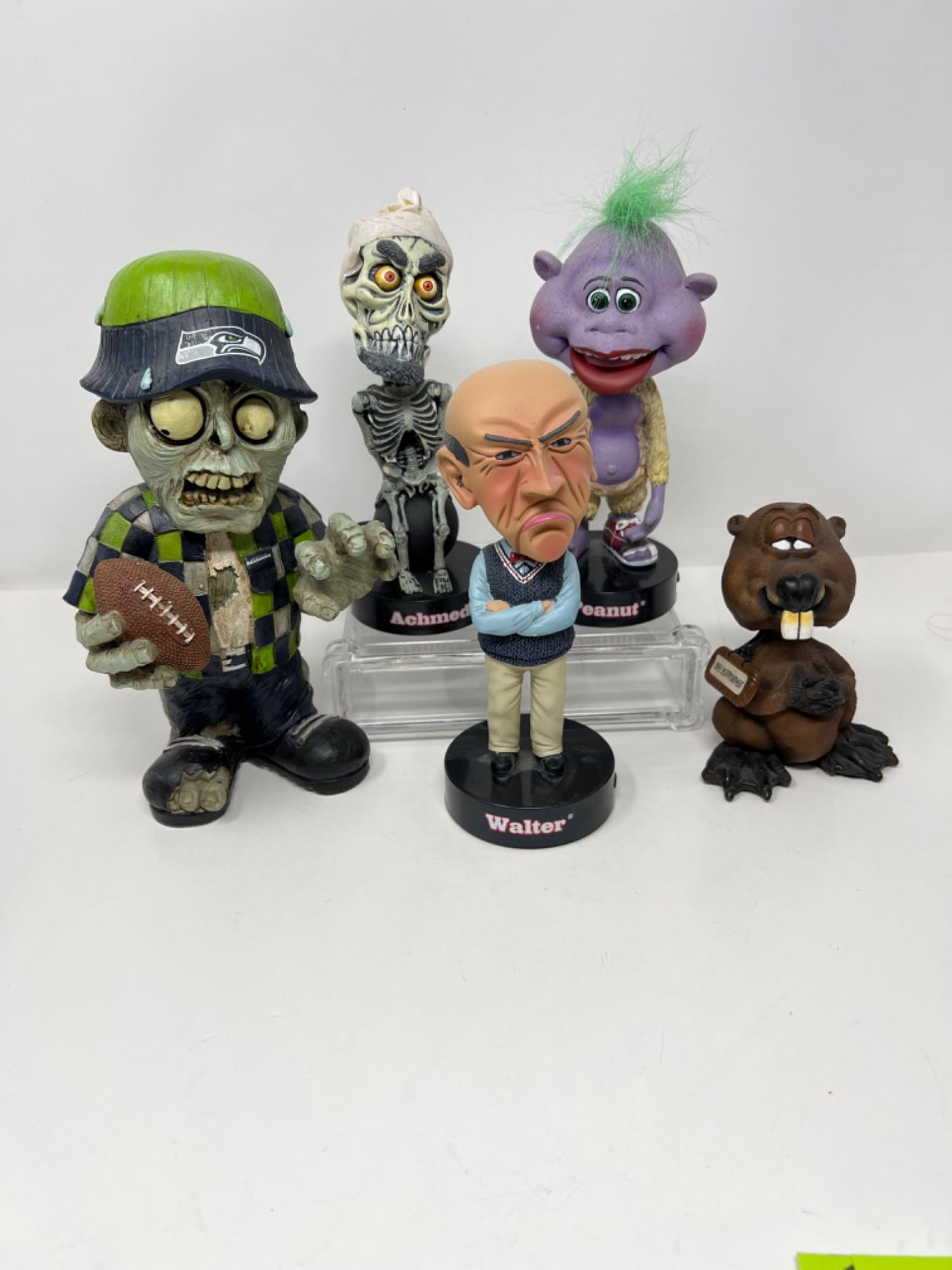 Seahawk 9” tall Resin Zombie Figure Jeff Dunham, puppeteer, 7” tall character bobbleheads: Achmed, Walter, Peanut Cafe Disappointment 4.5” tall beaver bobblehead.