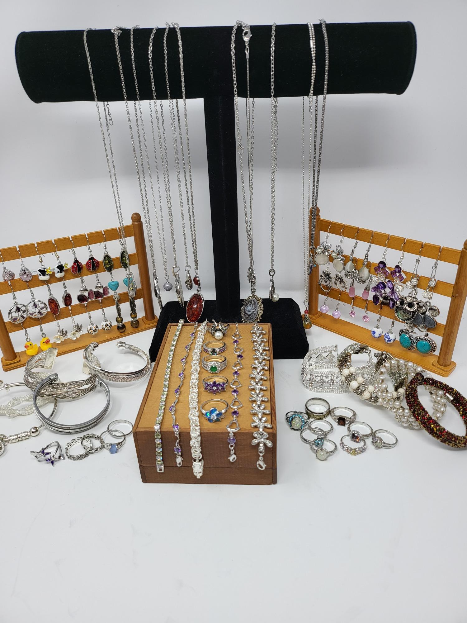 Here's a nice mixed lot of newer fashion jewelry: 19 rings. 14 bracelets. 24 pairs pierced earrings. 12 necklaces. A few are marked S925.