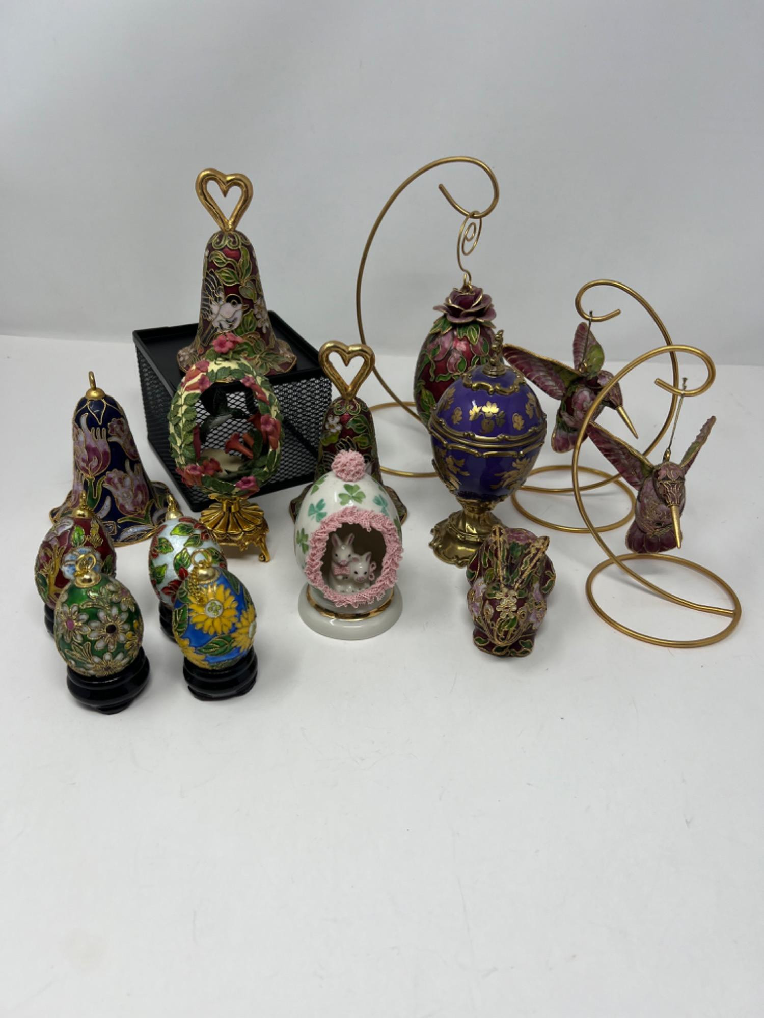 House of Faberge Musical Egg that plays "Swan Lake". Cloisonne 3.5" bells, bunny, 1.5" tall eggs on stands.