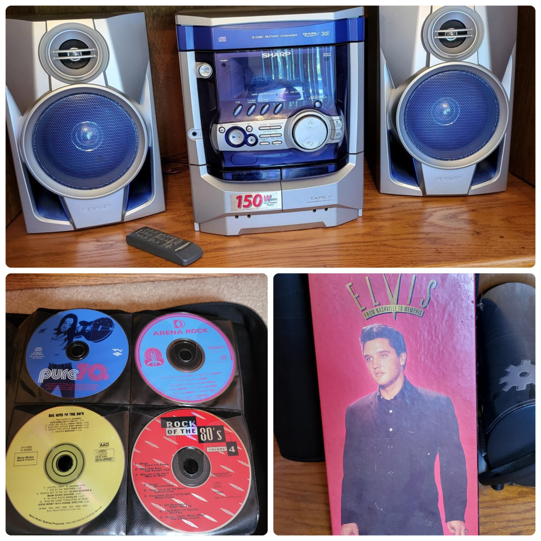 Sharp CD-X200 CD/stereo system with two speakers. Shelf of CD binder cases, filled with various artist CD's, movie soundtracks and more