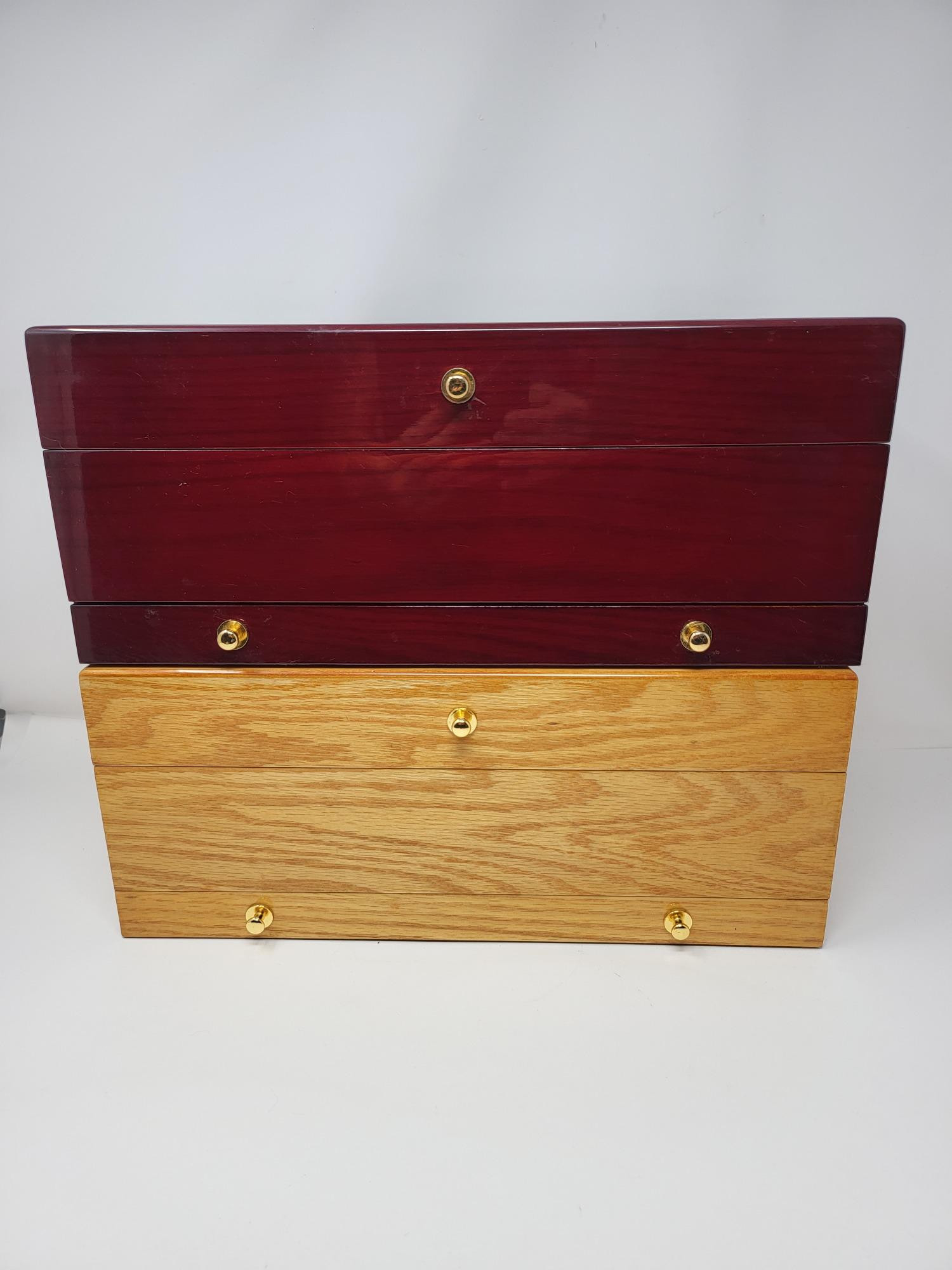 Two jewelry boxes. One lacquered oak, one is cherry finish. 14" x 8.25" x 6". Hinged trays, bottom tray, mirrored lid. Has many compartments to organize your treasures.