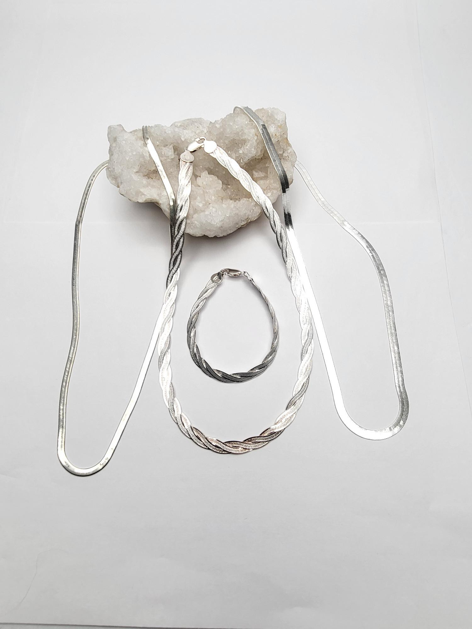 Reversible braided herringbone 925 Italy necklace & bracelet. Necklace is 16.5" and the bracelet is 7", 8mm wide. Two 925, 20" flexible herringbone chains 5mm & 7mm wide.