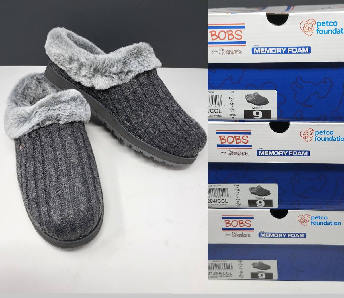 Three new pairs Bob's from Sketchers Memory Foam , Ice Angel, faux fur slippers. All three pairs are chorcoal grey and size 9.