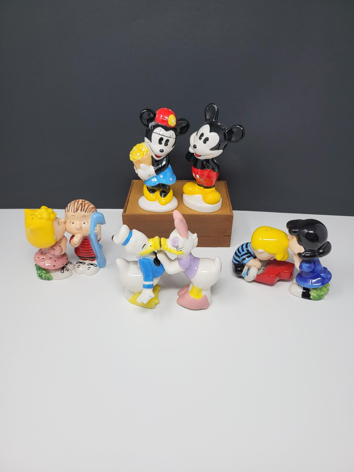 Four sets salt/pepper shakers: Mickey & Minnie 5". Donald & Daisy 4", Peanuts 2.5"-3.5".