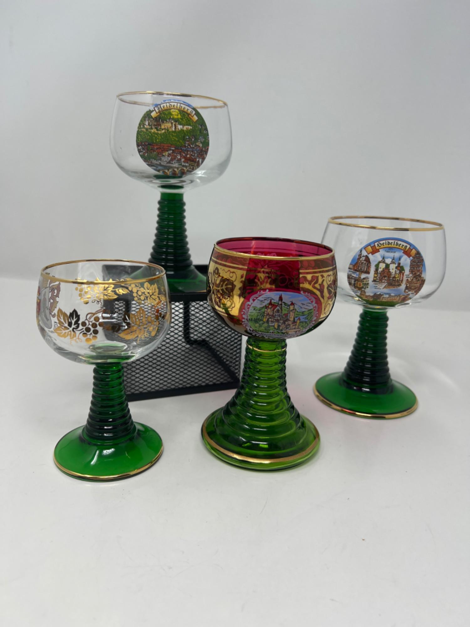 Souvenir Heidelberg gold trimmed Roemer glass with beehive stems. Possibly Luminarc? Two glasses are a tall 6.5" and two others are smaller 5.5" tall.