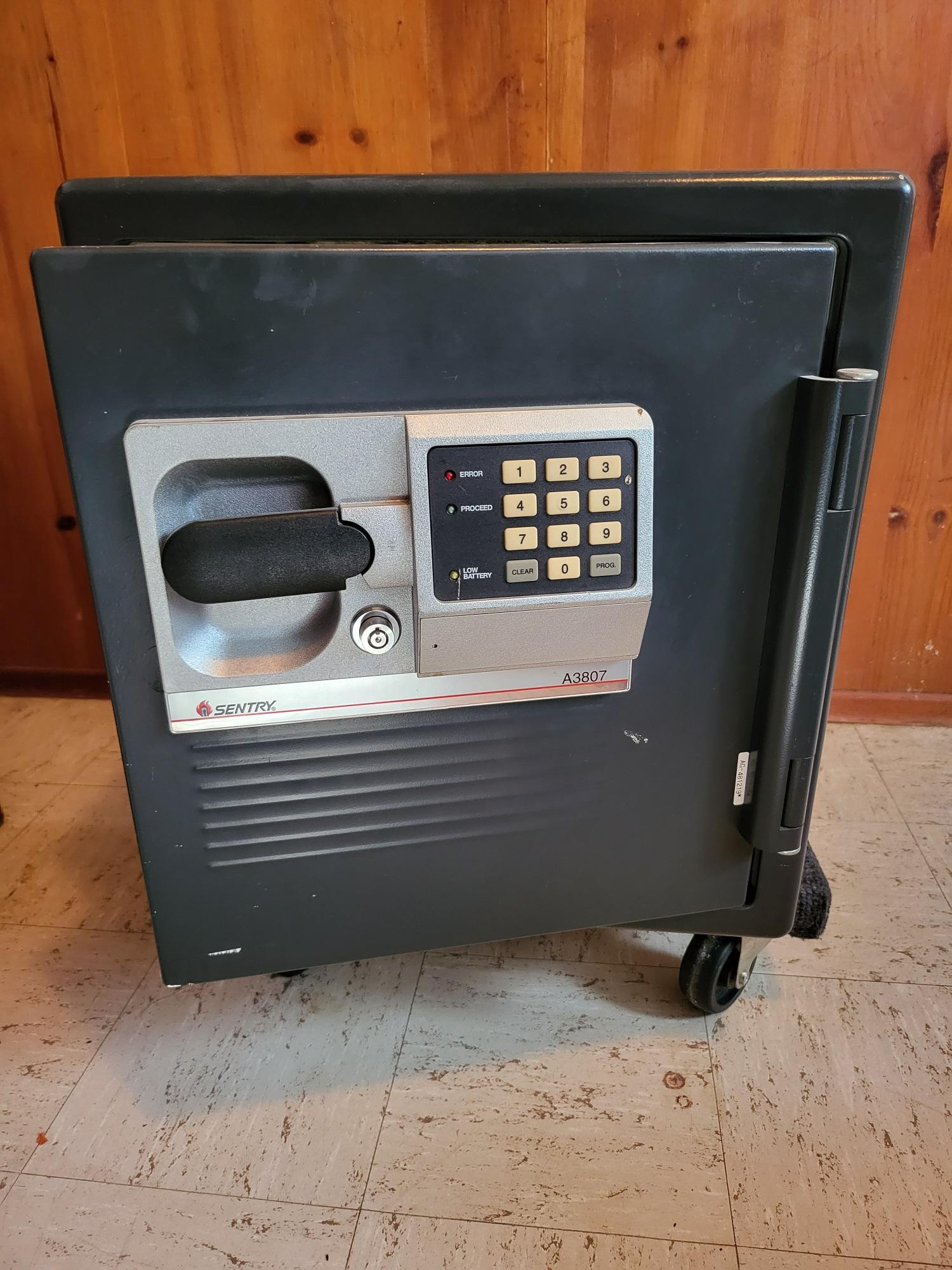 Sentry Safe. 15" wide x 16" deep x 17" tall. 2hr rating fire resistant safe. Very heavy and it is on a rolling dolly. Includes drawer key and door key.