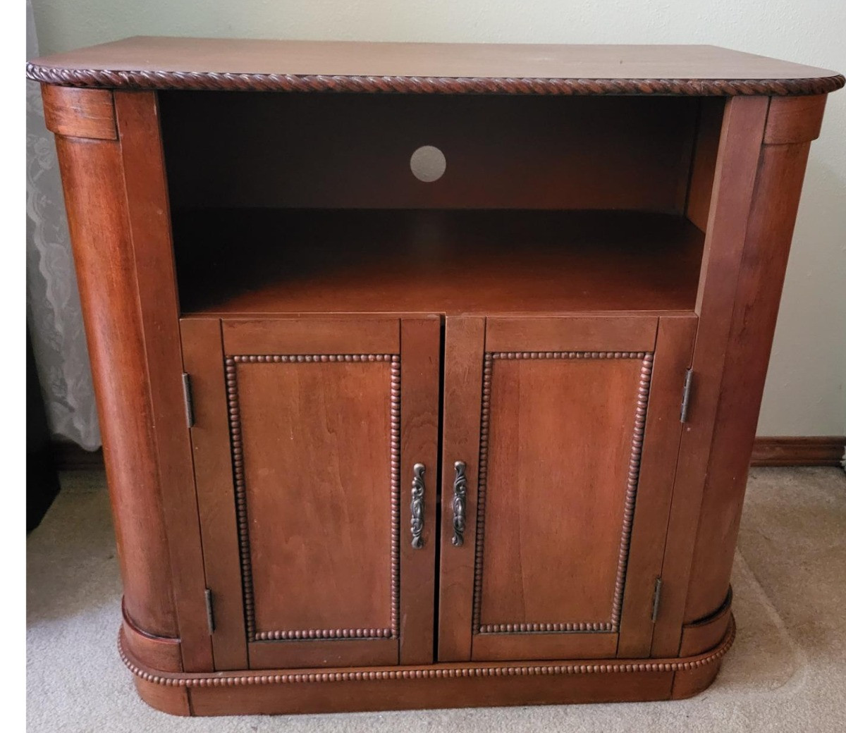 TV or Media console with two door storage cabinet and shelf and table top. Some scuffs on top . Measures: 32" wide x 18" deep x 30" tall. Bidding on this lot is an agreement that: (1.) You will have 2 capable, able-bodied persons to lift and load at a minimum. (2.) You