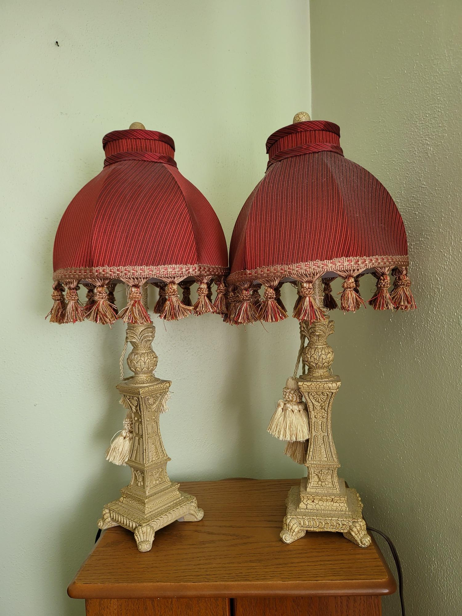 Carved Italian style lamps. Cranberry striped fabric shades with tassels. Measure 23" tall x 4.5" base